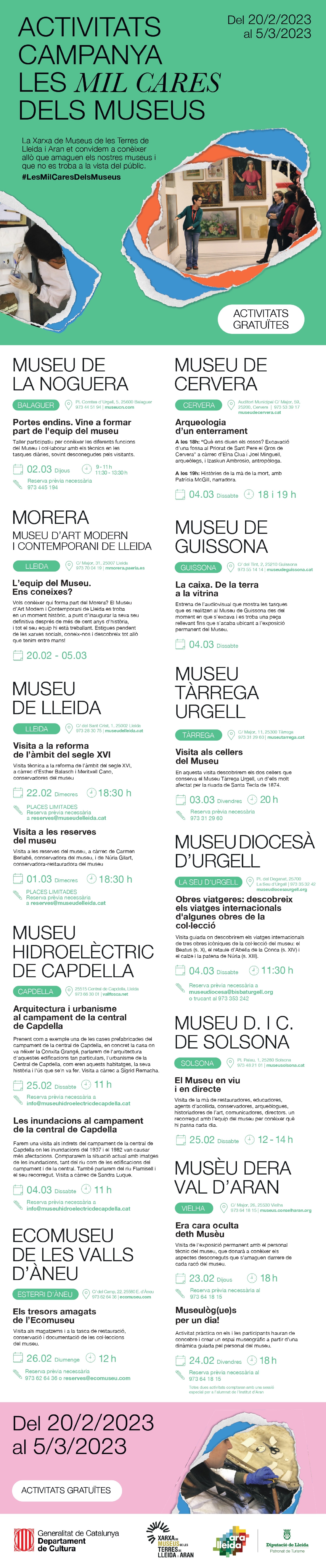 El Museu de la Noguera convidarà els i les visitants a formar part de l'equip del museu amb un taller participatiu per conèixer-ne les diferents funcions diàries; el Museu de Cervera proposa l'activitat 'Arqueologia d'un enterrament' on, de la mà d'antropòlogues i arqueòlogues coneixerem informació sobre el passat a través dels ossos d'una fossa al Priorat de Sant Pere el Gros de Cervera; l'Ecomuseu de les Valls d'Àneu oferirà una visita als seus magatzems, on mostrarà la tasca de restauració, conservació i documentació de les col·leccions del museu i el Museu de Guissona estrena l'audiovisual que mostra les tasques que realitzen des del moment en que s'excava i es troba una peça rellevant fins que s'acaba ubicant a l'exposició permanent del Museu.