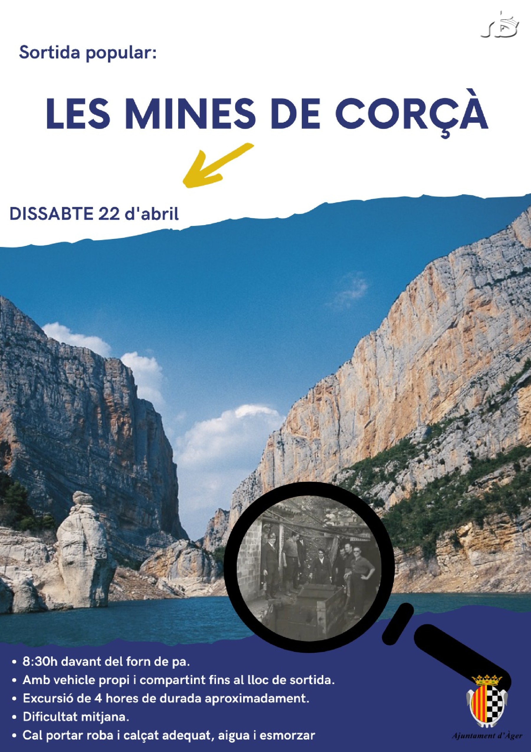 Aquest dissabte, 22 d'abril, l'Ajuntament d'Àger ofereix una sortida popular a les Mines de Corçà. Es tracta del camí vell de Mont-Rebei, una via que passa per les antigues Mines de Corçà, que ara són visibles a causa del baix nivell d'aigua del pantà de Canelles. L'excursió és de dificultat mitjana i consta d'aproximadament 3 hores de durada. Amb motiu de la sortida, s'aprofitarà per senyalitzar i sanejar el sender.