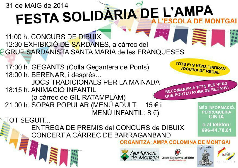 L'AMPA de l'escola de Montgai organitza una festa solidària per poder mantenir el servei de menjador escolar. Tindrà lloc el proper dissabte dia 31 de maig i s'organitzaran diverses activitats infantils.
