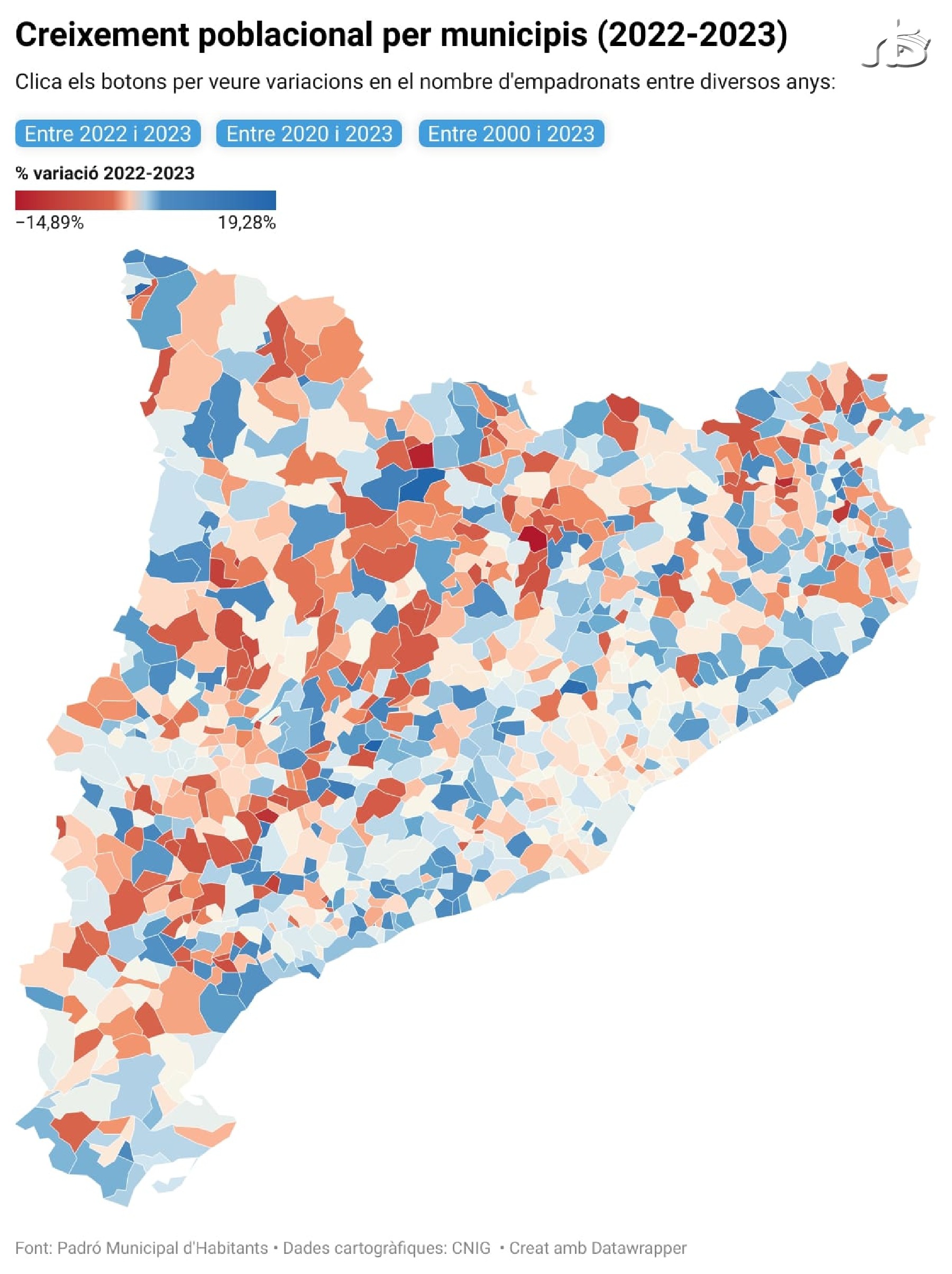 Per municipis, Palau de Santa Eulàlia (Alt Empordà) i Bolvir (Cerdanya) han vist els seus empadronats créixer en més d'un terç en tres anys –entre els de més de 2.000 habitants, destaquen Roda de Berà (Tarragonès), Olesa de Bonesvalls (Alt Penedès) i Vilablareix (Gironès), amb al voltant d'un 15% d'augment. A la banda baixa, Torres de Segre (Segrià) i la Llagosta (Vallès Oriental) són les úniques poblacions amb més de 2.000 habitants que han caigut més d'un 3% de residents des de l'inici de la pandèmia.