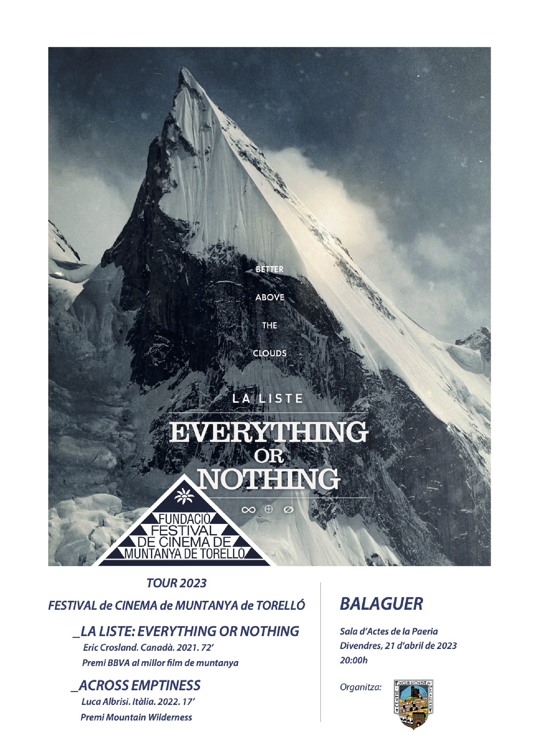 El Centre Excursionista de Balaguer organitza la projecció de dues pel·lícules documentals premiades en la 40a edició del Festival de Cinema de Muntanya de Torelló. El Tour 2023 del festival farà parada a la sala d'actes de la Paeria de Balaguer el pròxim divendres 21 d'abril a les 20:00h. Es visualitzarà la travessa dolomítica "Across emptiness" i l'adrenalina de l'esquí alpí de "La liste: everything or nothing".