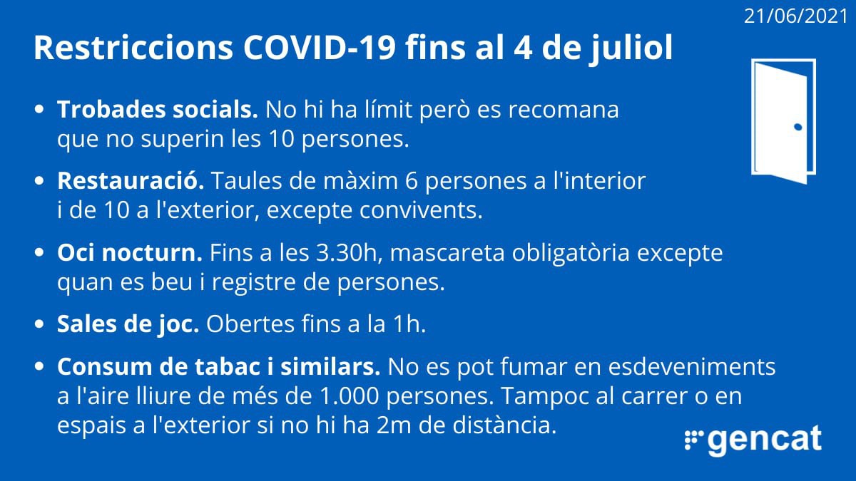 La prohibició de la limitació de les reunions a 10 persones de diferents bombolles de convivència ha passat de prohibició a recomanació aquest dilluns. Així, a partir d'ara no hi haurà límit en les trobades socials, tot i que des de les autoritats recomanen evitar grans trobades. Aquesta és una de les mesures de les noves restriccions aprovades pel Procicat que entren en vigor aquest dilluns i estaran vigents fins al 5 de juliol. A la restauració, el nombre màxim de comensals per taula passen a ser 6 persones a l'interior i 10 en terrasses. La distància entre taules o grups de taules passa de 2 metres a 1,5 metres. Aquesta mitjanit han reobert els locals d'oci nocturn i ja es poden habilitar espais de ball a festes major o envelats.