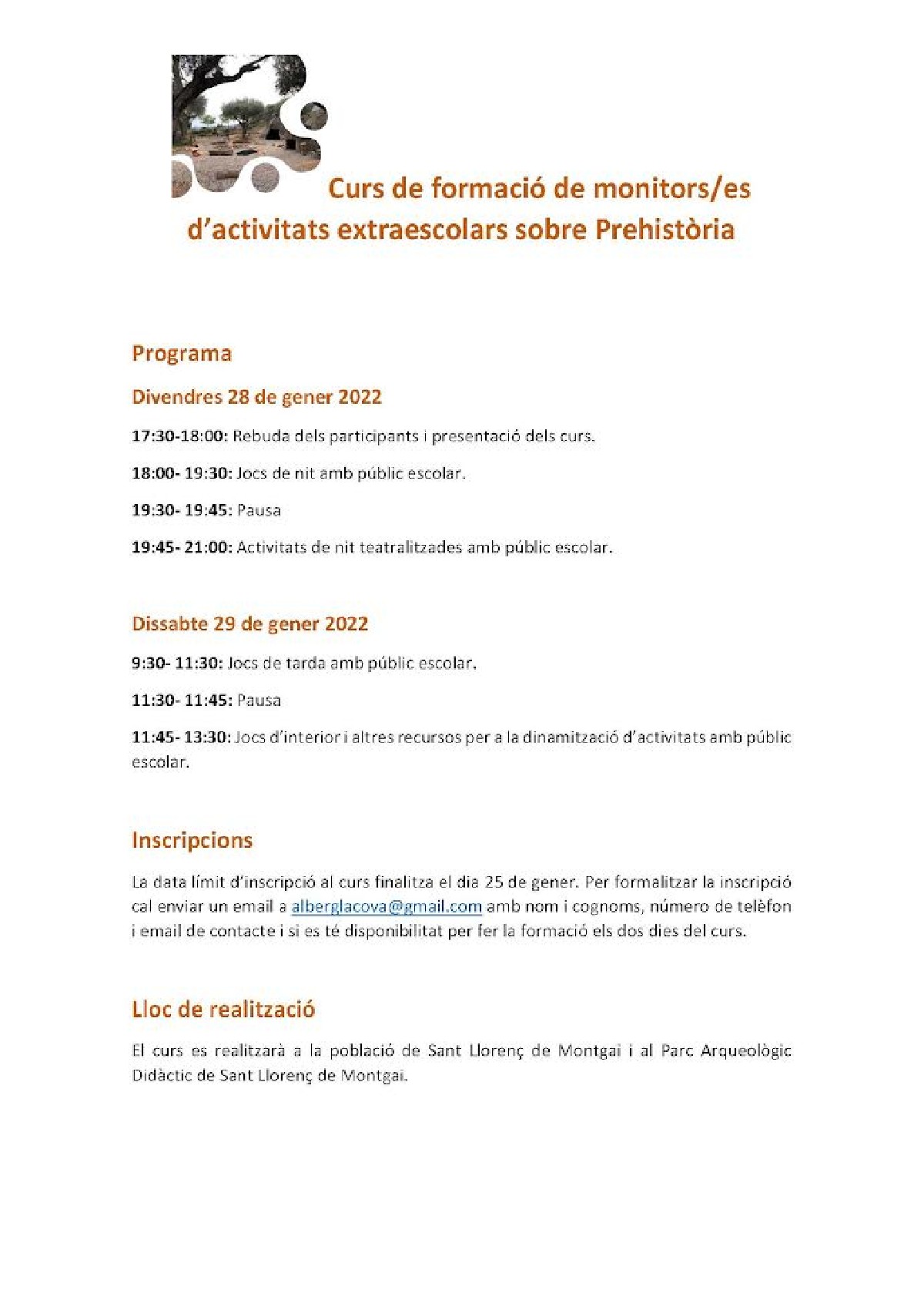 La data límit d'inscripció del curs finalitza el dia 25 de gener, per realitzar la inscripció és necessari contactar amb alberglacova@gmail.com enviant nom i cognoms, número de telèfon i email de contacte i si es té disponibilitat per fer la formació els dos dies del curs