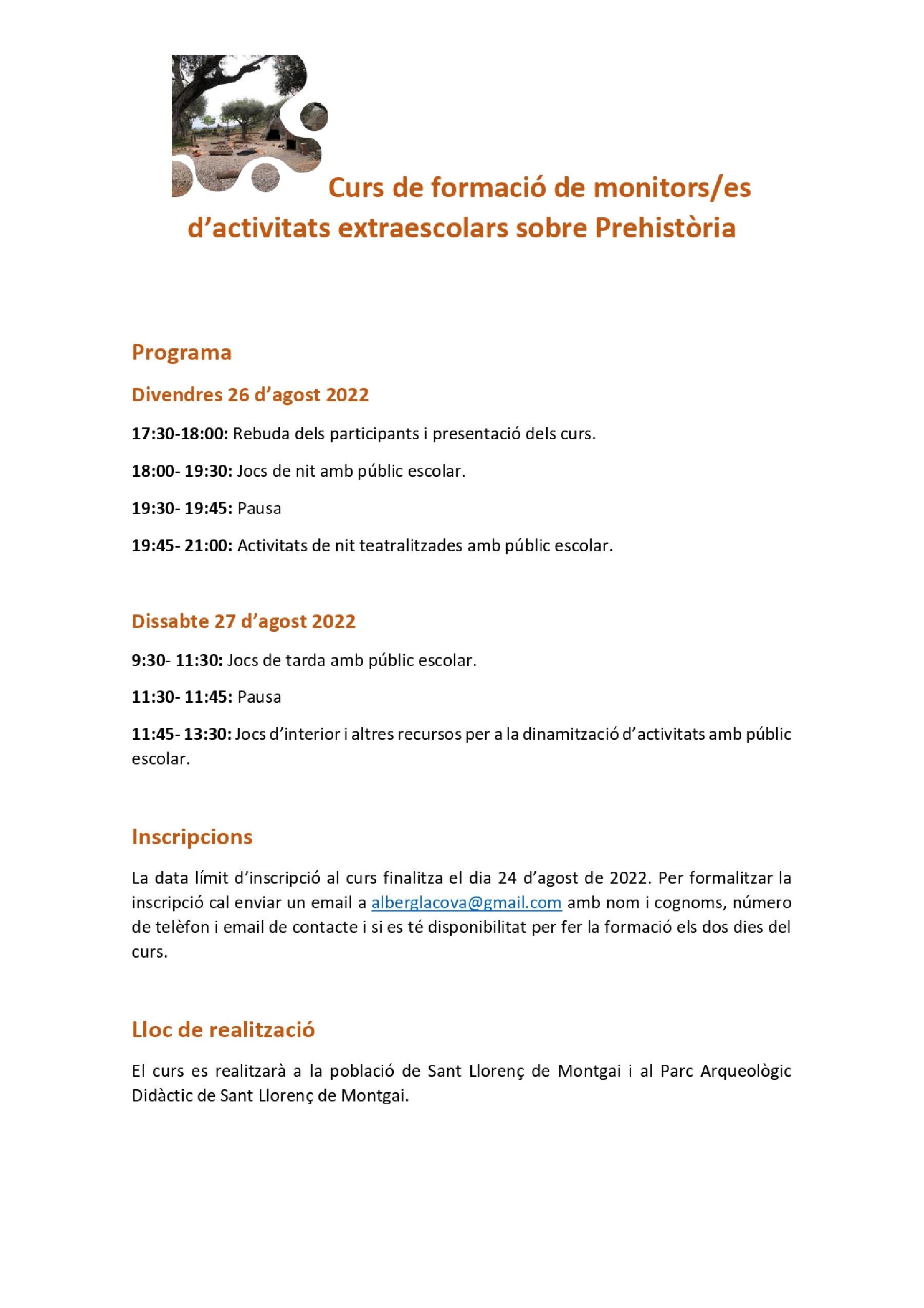 La data límit d'inscripció del curs finalitza el dia 24 d'agost, per realitzar la inscripció és necessari contactar amb alberglacova@gmail.com enviant nom i cognoms, número de telèfon i email de contacte i si es té disponibilitat per fer la formació els dos dies del curs.