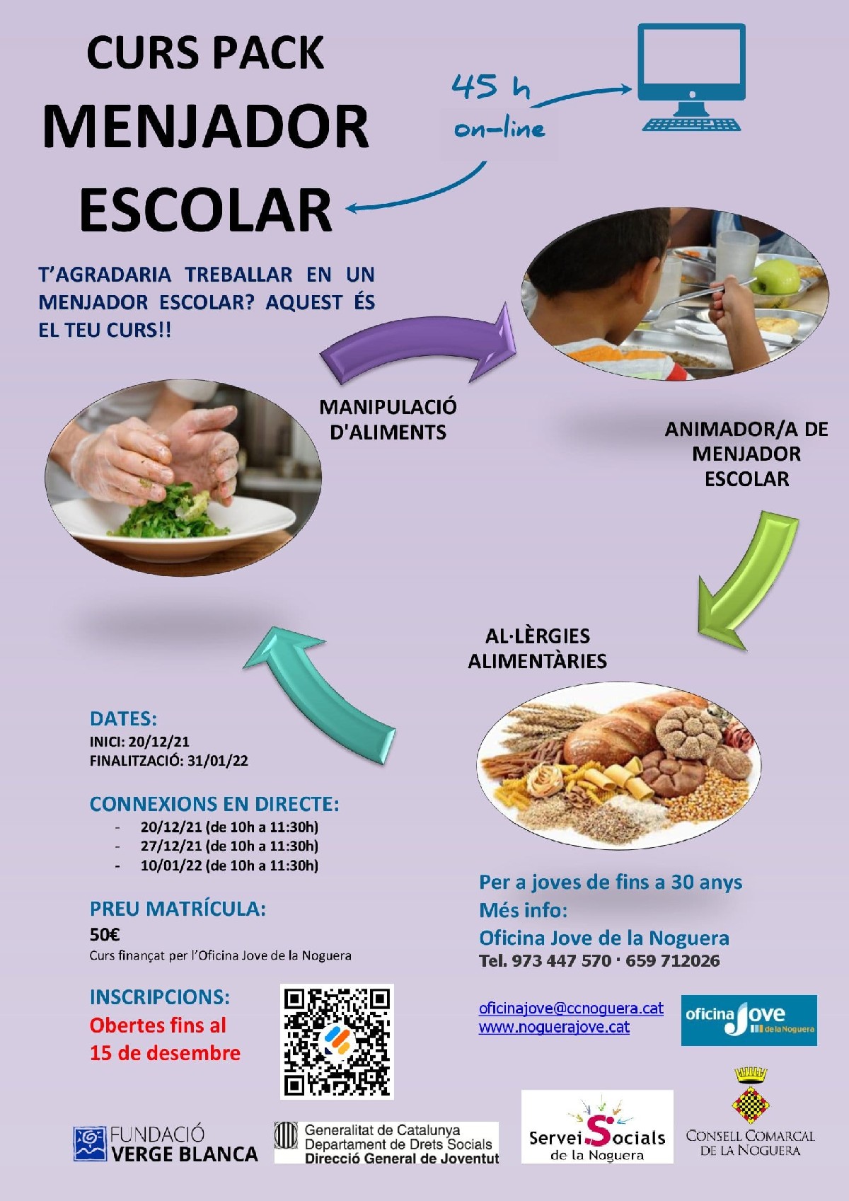 L'Oficina Jove del Consell Comarcal de la Noguera posarà en marxa el proper 20 de desembre i fins al 31 de gener de l'any vinent un nou curs en línia on s'inclouran tots els coneixements necessaris per treballar en un menjador escolar. La formació, dirigida exclusivament a persones joves de la comarca de la Noguera de fins a 30 anys, s'ha tornat a organitzar després de l'èxit de participació de la primera edició, duta a terme ara fa gairebé un any. El curs té una durada de 45 hores i inclou un tres mòduls diferents, corresponents als de manipulació d'aliments, animació de menjador escolar i al·lèrgies alimentàries.
