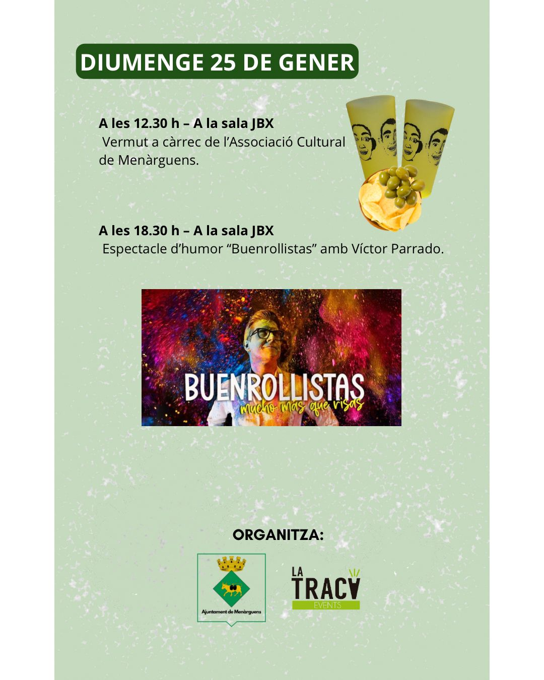 Els actes es clouran diumenge 25 de gener amb un vermut popular a les 12.30 h a la Sala JBX, organitzat per l’Associació Cultural de Menàrguens. A la tarda, a partir de les 18.30 h, arribarà un dels plats forts de la festa amb l’espectacle d’humor Buenrollistas, de Víctor Parrado. L’humorista presentarà un show que combina rialles i reflexió, amb una mirada honesta sobre el “bonrotllisme”, allunyada de tòpics i falsos positivismes. L’espectacle, apte per a tots els públics, arriba a Menàrguens després de consolidar-se a la cartellera barcelonina, amb diverses funcions exhaurides al Teatre Goya, i es presenta com una oportunitat única per tancar la Festa Major d’Hivern amb bon humor i molt bon ambient.