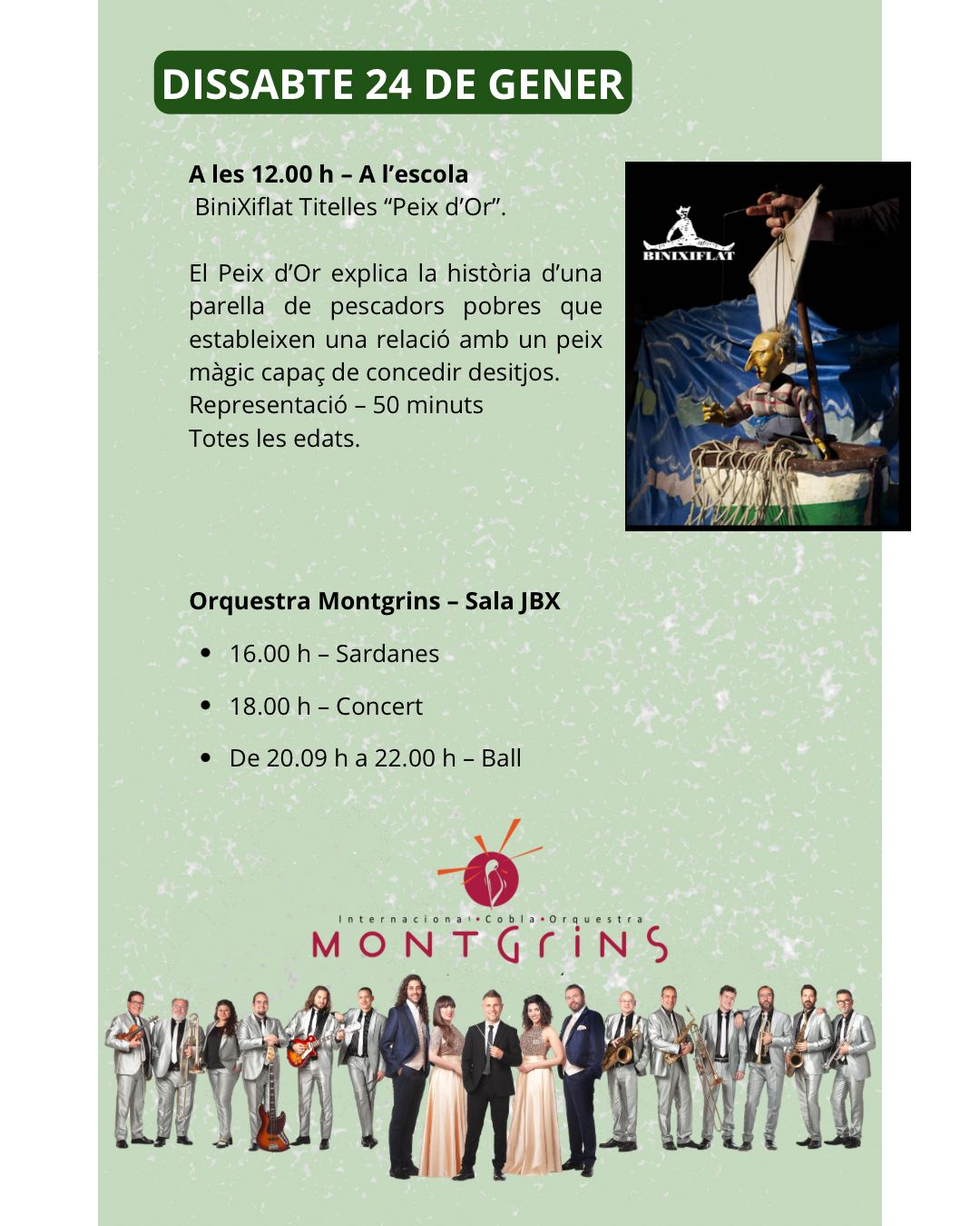 Dissabte al migdia l’escola serà l’escenari de l’espectacle de titelles Peix d’Or, de BiniXiflat Titelles, una proposta per a totes les edats que explica la història d’una parella de pescadors i un peix màgic capaç de concedir desitjos. A la tarda, la Sala JBX acollirà una completa sessió amb sardanes a les 16.00 h, concert a les 18.00 h i seguidament ball, tot a càrrec de l’Orquestra Montgrins.