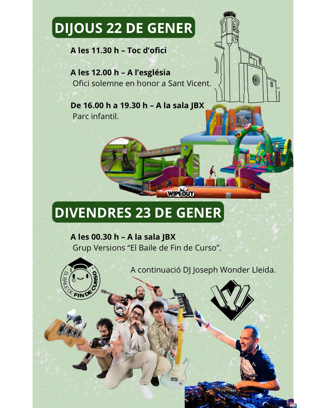 Els actes s’iniciaran dijous amb el tradicional toc d’ofici a les 11.30 h, seguit de l’ofici solemne en honor a Sant Vicent, a l’església. A la tarda, la Sala JBX acollirà el parc infantil amb l’activitat WIPEOUT.