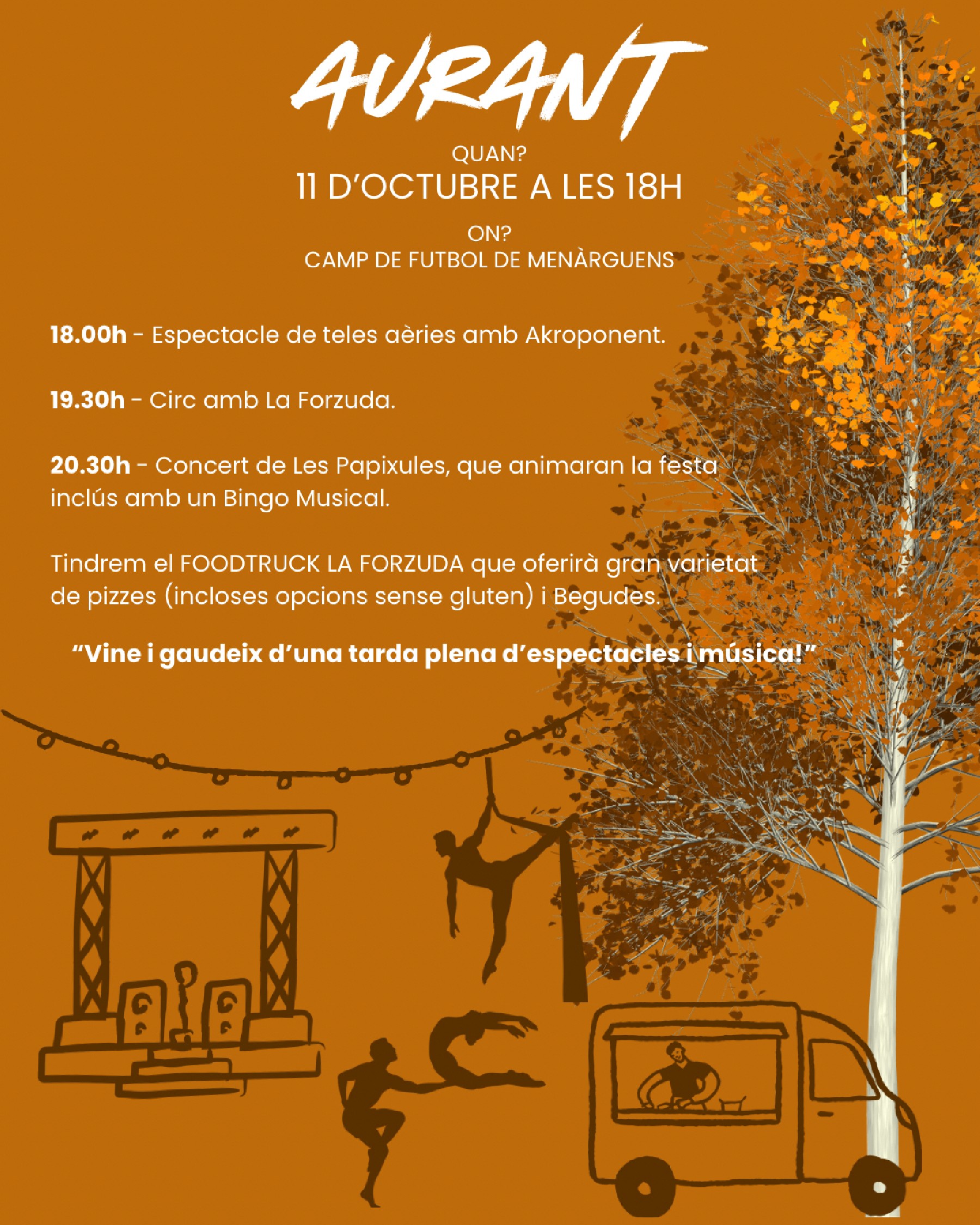 Aquest dissabte 11 d'octubre, el Camp de Futbol de Menàrguens acollirà l'Aurant, el festival de tardor que combinarà circ, música i gastronomia per a tots els públics.