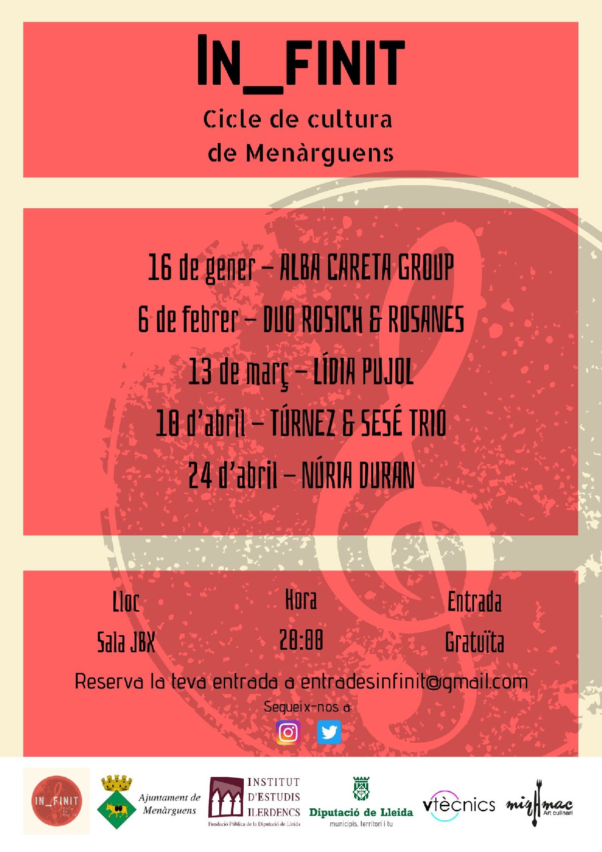 Menàrguens presenta el cartell del festival IN_FINIT, un cicle de 5 concerts que es faran entre gener i abril amb noms com Alba Careta Grup, Rosich and Rosanes i Lídia Pujol. L'entrada es gratuïta i es podrà reservar properament.