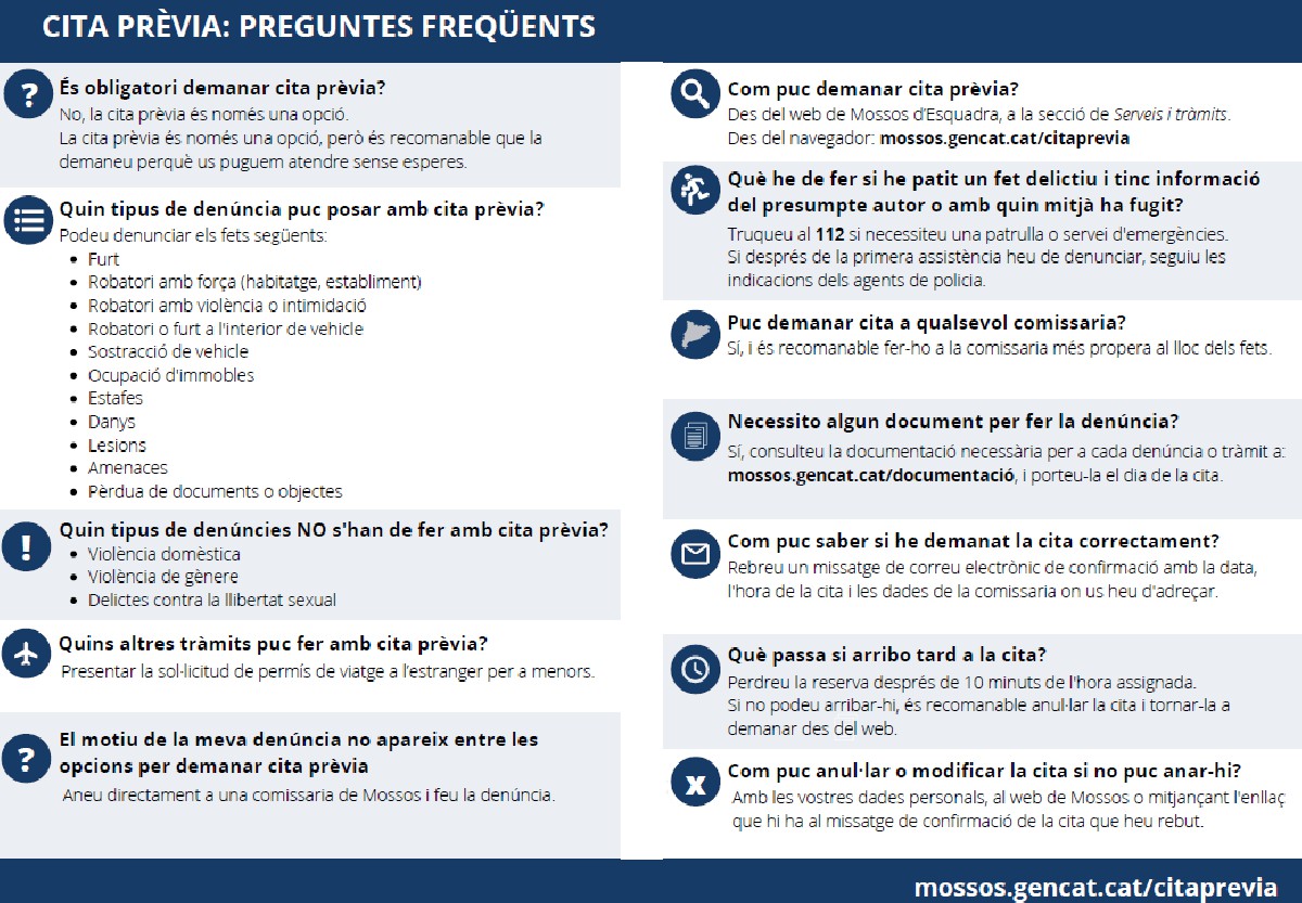 Nou servei de cita prèvia a les comissaries de Mossos d'esquadra. Els ciutadans podran reservar cita al web per anar a una comissaria a denunciar, evitant així fer cua i esperes innecessàries