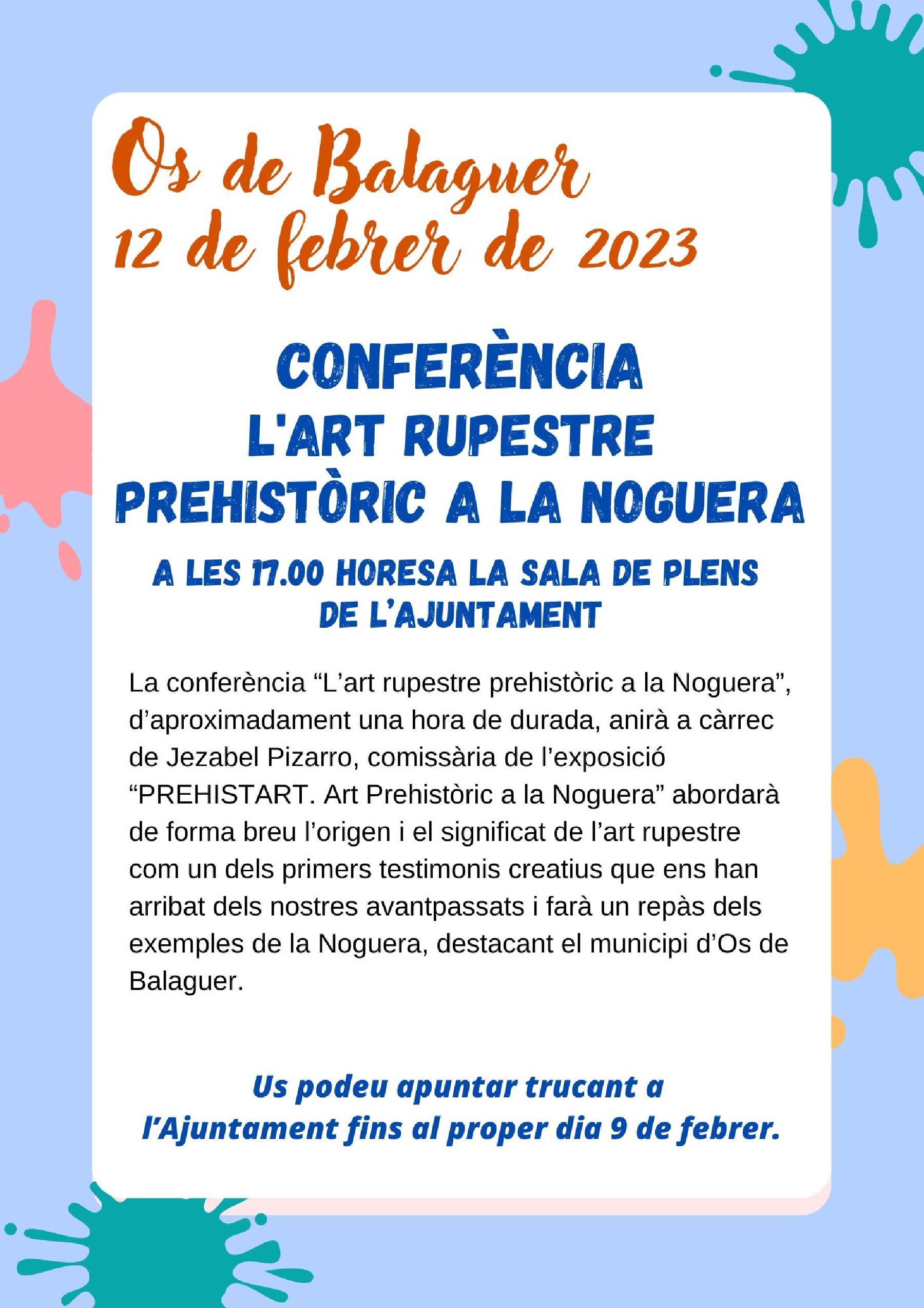 Finalment, a les 5 de la tarda i a la Sala de Plens de l'Ajuntament es realitzarà la conferència "L'art rupestre prehistòric a la Noguera", d'aproximadament una hora de durada, i que anirà a càrrec de Jezabel Pizarro, comissària de l'exposició "PREHISTART. Art Prehistòric a la Noguera" abordarà de forma breu l'origen i el significat de l'art rupestre com un dels primers testimonis creatius que ens han arribat dels nostres avantpassats i farà un repàs dels exemples de la Noguera, destacant el municipi d'Os de Balaguer.