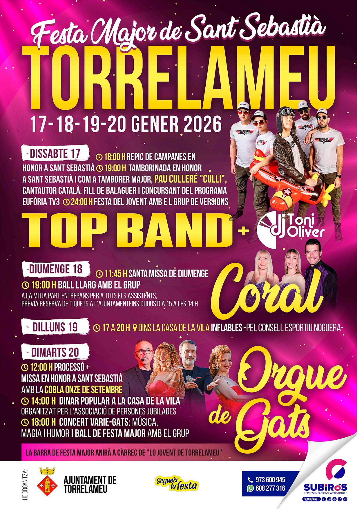 Els dies següents inclouen activitats infantils amb inflables a la Casa de la Vila, la processó i missa del 20 de gener amb la Cobla Onze de Setembre, dinar popular organitzat per l’Associació de Persones Jubilades i el concert Varie-Gats, amb música, màgia i humor, per tancar la festivitat amb un ball de Festa Major.