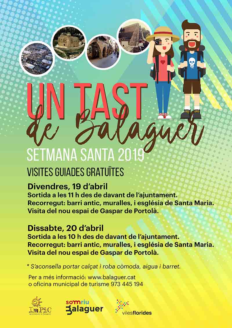 L'àrea Promoció Econòmica, Fires i Turisme de l'ajuntament de Balaguer ha organitzat, per aquesta Setmana Santa unes visites guiades gratuïtes per tal de donar a conèixer la ciutat a tots aquells visitants o turistes. Aquestes visites, anomenades 'Un tast de Balaguer', es realitzaran aquest divendres dia 19 a les 11 del matí i dissabte dia 20 a partir a les 10.