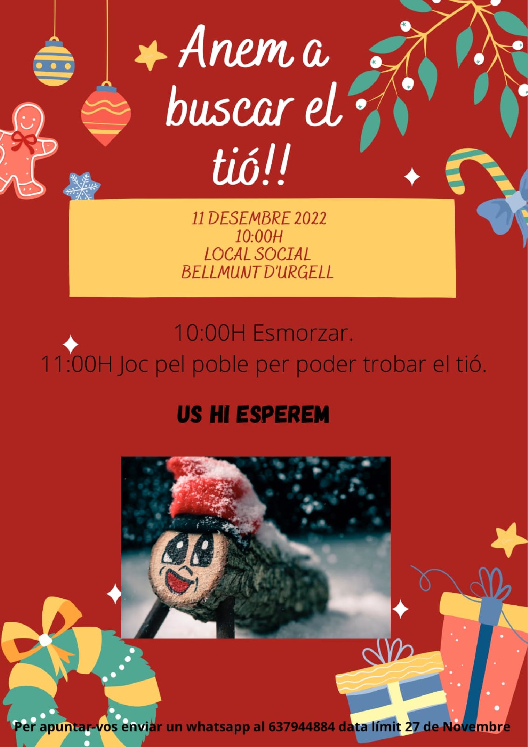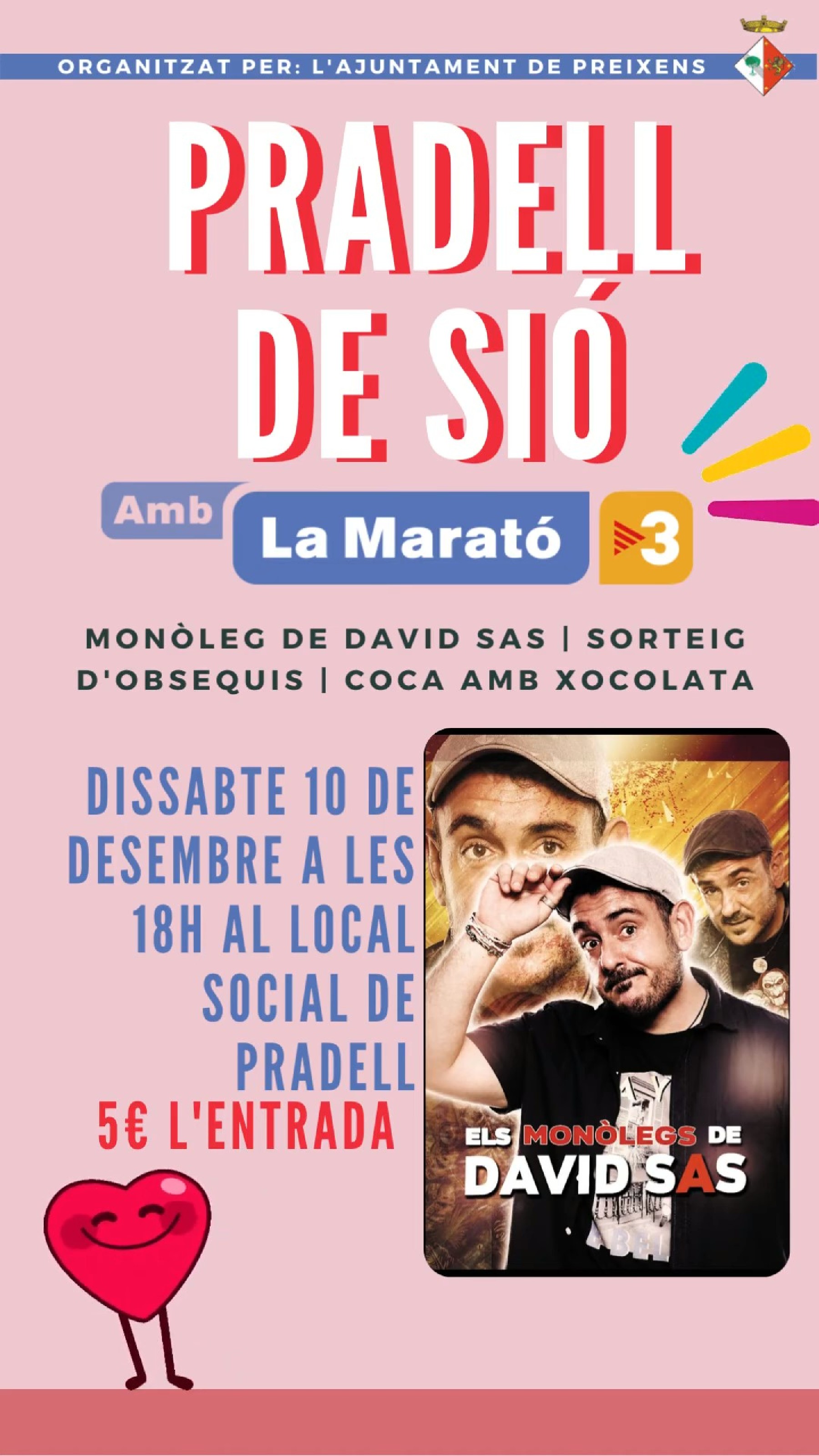 Serà a les 6 de la tarda a Local Social i comptarà amb un monòleg de David Sas. Durant la tarda es farà també sorteig d'obsequis i hi haurà una xocolatada.