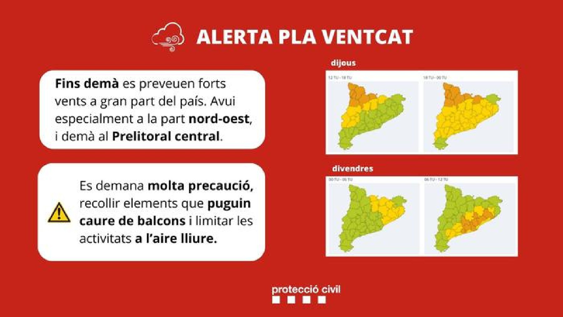Divendres, el fort vent es generalitzarà i afectarà especialment les comarques del litoral i prelitoral central i de Girona, sobretot a la franja del matí i migdia. Protecció Civil demana retirar qualsevol objecte de terrasses o façanes que pugui caure, i extremar les precaucions en les activitats a l'aire lliure, sobretot en zones boscoses i espais elevats.