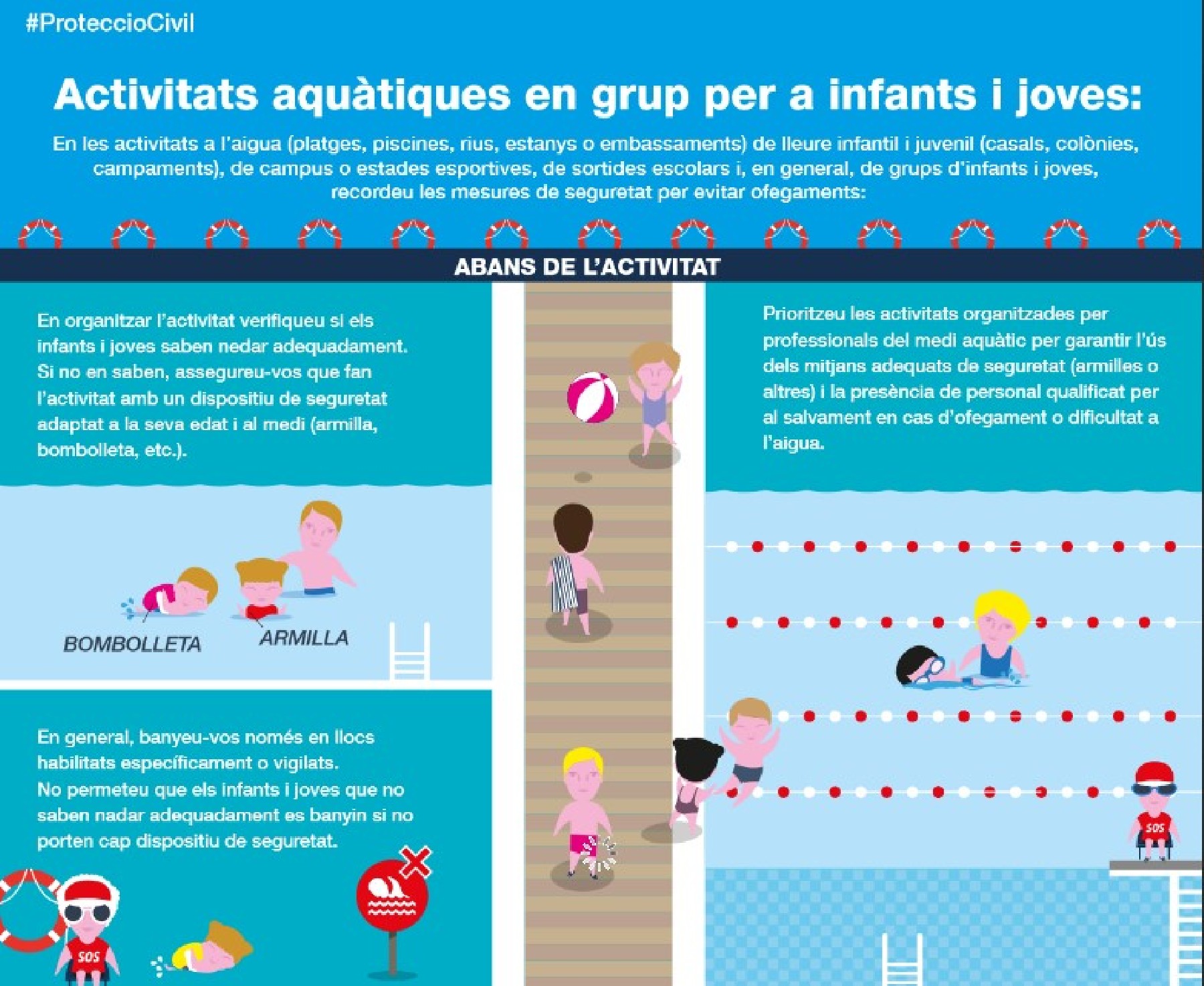 Protecció Civil ha recordat també que s'han de respectar sempre les indicacions dels socorristes, ensenyar a nedar els més petits al més aviat possible, fer ús de dispositius que els permetin surar si no saben nedar i evitar que els nens juguin a donar-se empentes a la bora de la piscina, entre d'altres.
