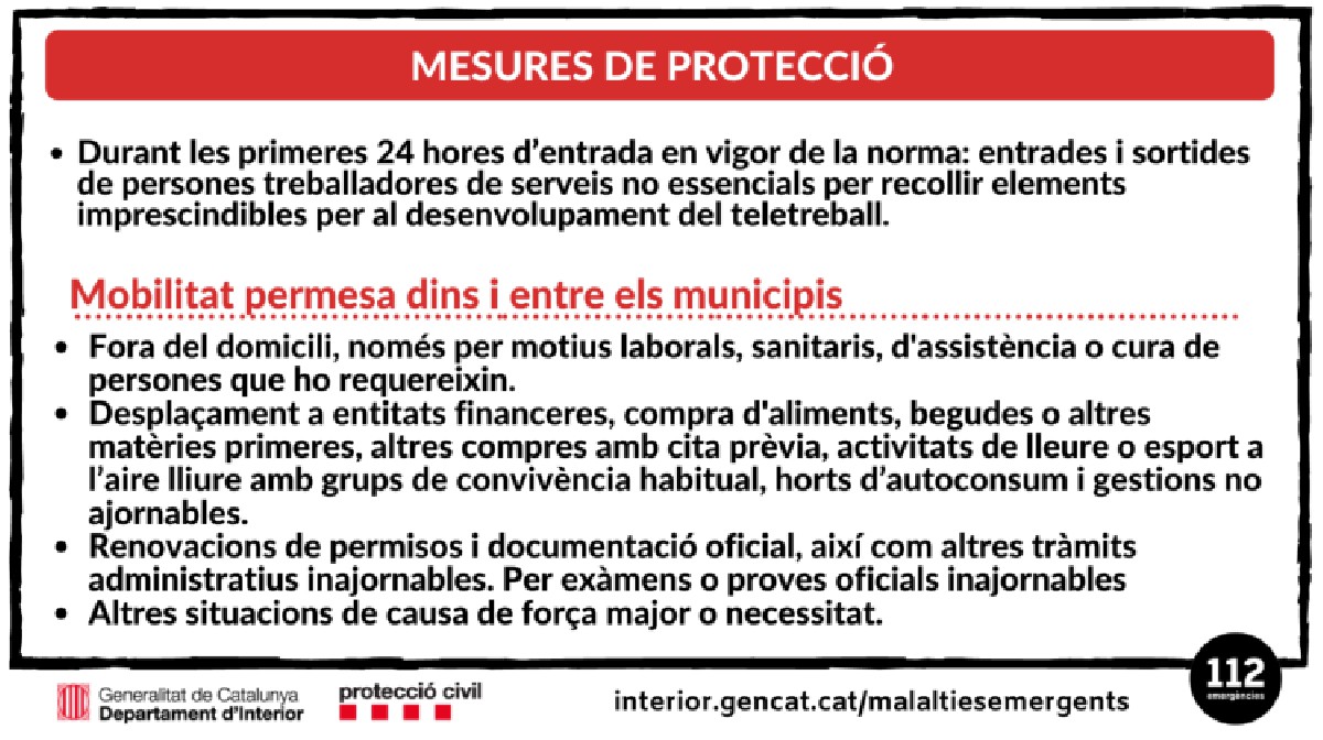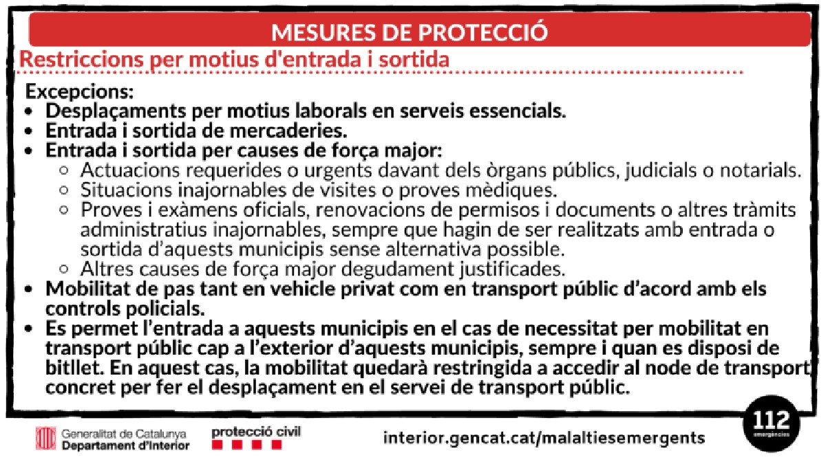La resolució té una vigència inicial de quinze dies revisables i estableix que s'aniran emetent informes periòdics dels efectes de les mesures. Entre aquestes, es restringeix a partir de les 16.00 hores d'avui l'entrada i sortida als municipis, a excepció dels desplaçaments per motius laborals per raó de serveis considerats essencials; es permet les sortides del domicili i la circulació per les vies d'ús públic, respectant les mesures de protecció individual i col·lectiva establertes per les autoritats competents, en supòsits relacionats amb l'assistència al lloc de treball quan no es pugui dur a terme a través del teletreball, amb l'assistència a centres i serveis sanitaris, amb tenir cura de persones dependents i vulnerables, amb l'accés als establiments comercials minoristes d'alimentació i matèries primeres (l'accés a la resta d de comerços s'ha de fer amb cita o avís previs), i amb la realització de tràmits urgents davant dels òrgans públics, judicials o notarials, i d'exàmens o proves oficials inajornables.