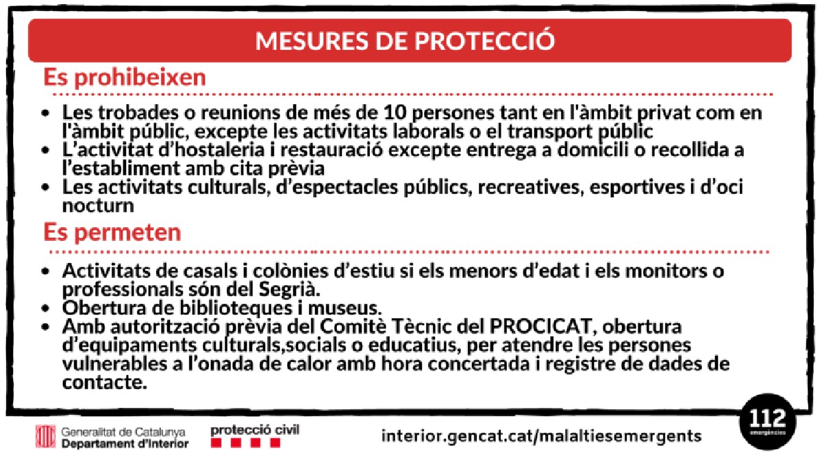 També se suspèn l'obertura al públic d'equipaments culturals com ara arxius, de locals i establiments on es desenvolupen espectacles públics, com és el cas de teatres, cinemes i esdeveniments esportius, activitats lúdiques, recreatives, com ara piscines, parcs d'atraccions i parcs infantils, activitats esportives, com ara gimnasos, i dels locals i establiments d'oci nocturn, com ara sales de festa i discoteques, entre altres de similars, que impliquin una interacció d'un nombre important de persones que pertanyin a grups de convivència diferents per l'increment del risc de transmissió comunitària. Les biblioteques i els museus romanen oberts havent de seguir el corresponent pla sectorial de represa aprovat pel Comitè de Direcció del Pla d'actuació del PROCICAT. Tanmateix, els ajuntaments, amb autorització prèvia de Comitè de Direcció del Pla d'actuació del PROCICAT, podran habilitar espais adequats, incloent equipaments culturals, socials o educatius, per fer front a l'onada de calor, perquè puguin fer-ne ús prioritàriament les persones vulnerables, respectant les mesures de protecció individual i col·lectiva.