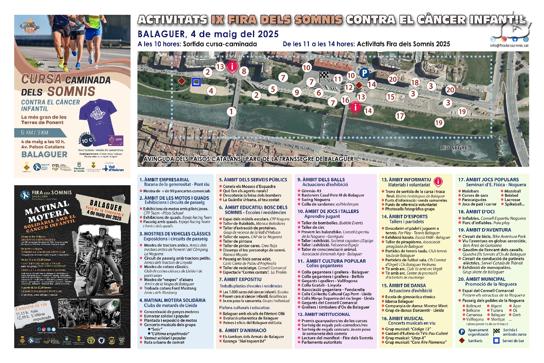 Aquesta diada solidària començarà amb la Cursa-caminada dels Somnis, la més gran de les Terres de Ponent, que pretén superar les 3.200 samarretes venudes en l'edició anterior. Les modalitats de 5 i 3 km, amb dues categories d'adults i infantils, tindran un recorregut urbà per la ciutat de Balaguer.
