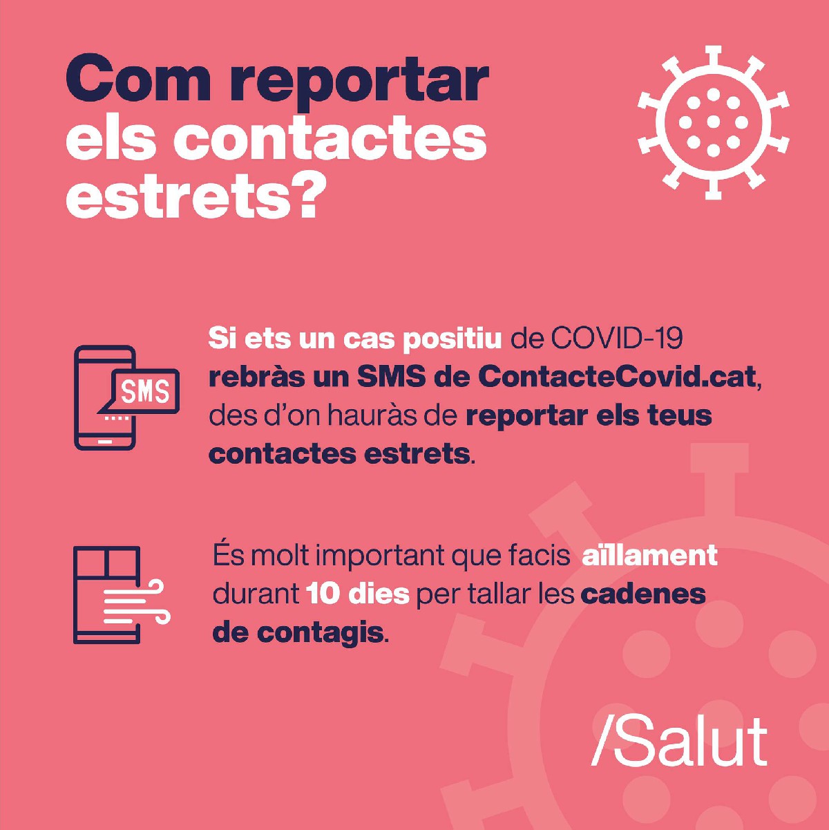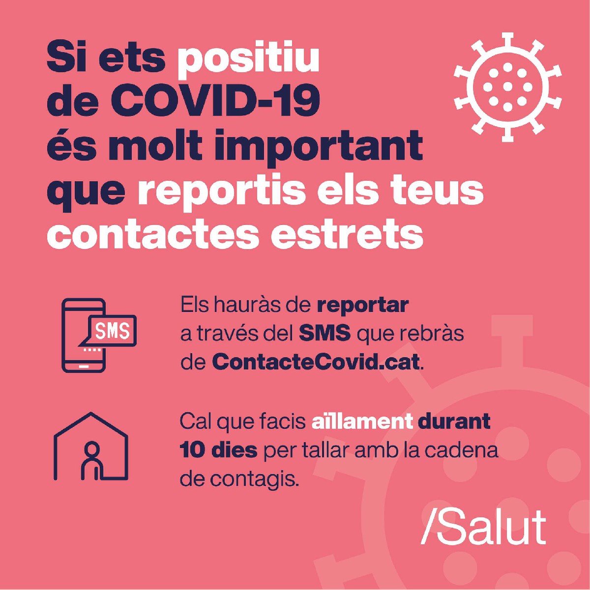 Els contactes estrets asimptomàtics d'un cas positiu no es testaran de forma sistemàtica, hauran de fer el preceptiu aïllament 10 dies i rebran un SMS amb un enllaç a web contactecovid.cat per tramitar la baixa laboral, si s'escau