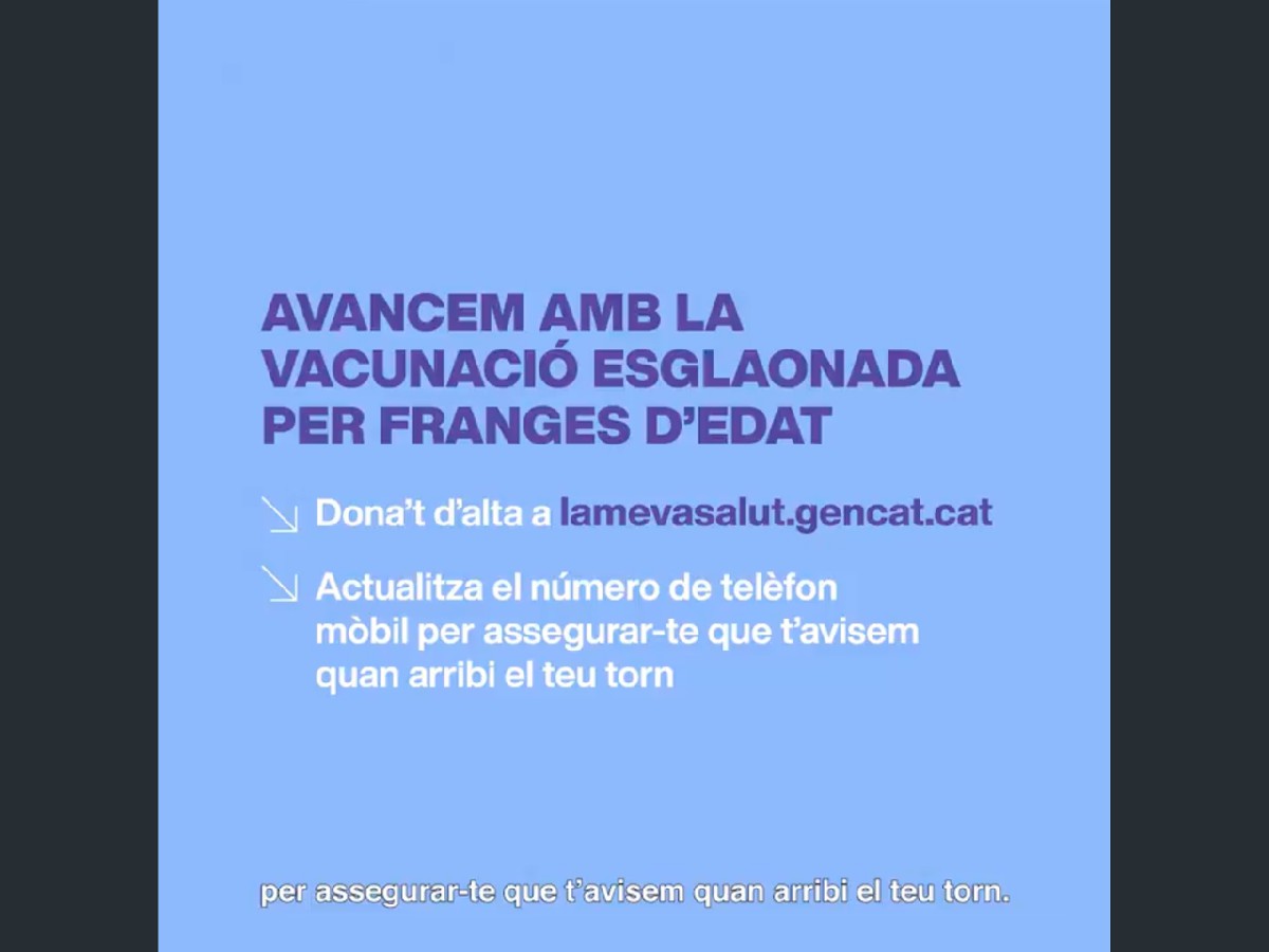 "Dona't d'alta i actualitza el número de telèfon mòbil per assegurar-te que t'avisem quan arribi el torn de la teva franja d'edat", s'insisteix en la campanya de conscienciació, que compta amb cartells publicitaris i un espot de 30 segons per a televisió, youtube i xarxes socials. Salut assenyala que es tracta només de la primera fase d'una campanya que anirà evolucionant amb noves peces de comunicació "amb l'objectiu d'informar cadascuna de les franges d'edat que ha arribat el seu torn i adreçar-los a demanar cita". De fet, el mateix secretari general de Salut, Marc Ramentol, ha apostat aquest diumenge per reforçar la conscienciació en alguns segments de la població per mostrar que la vacunació és "necessària" i "funciona".