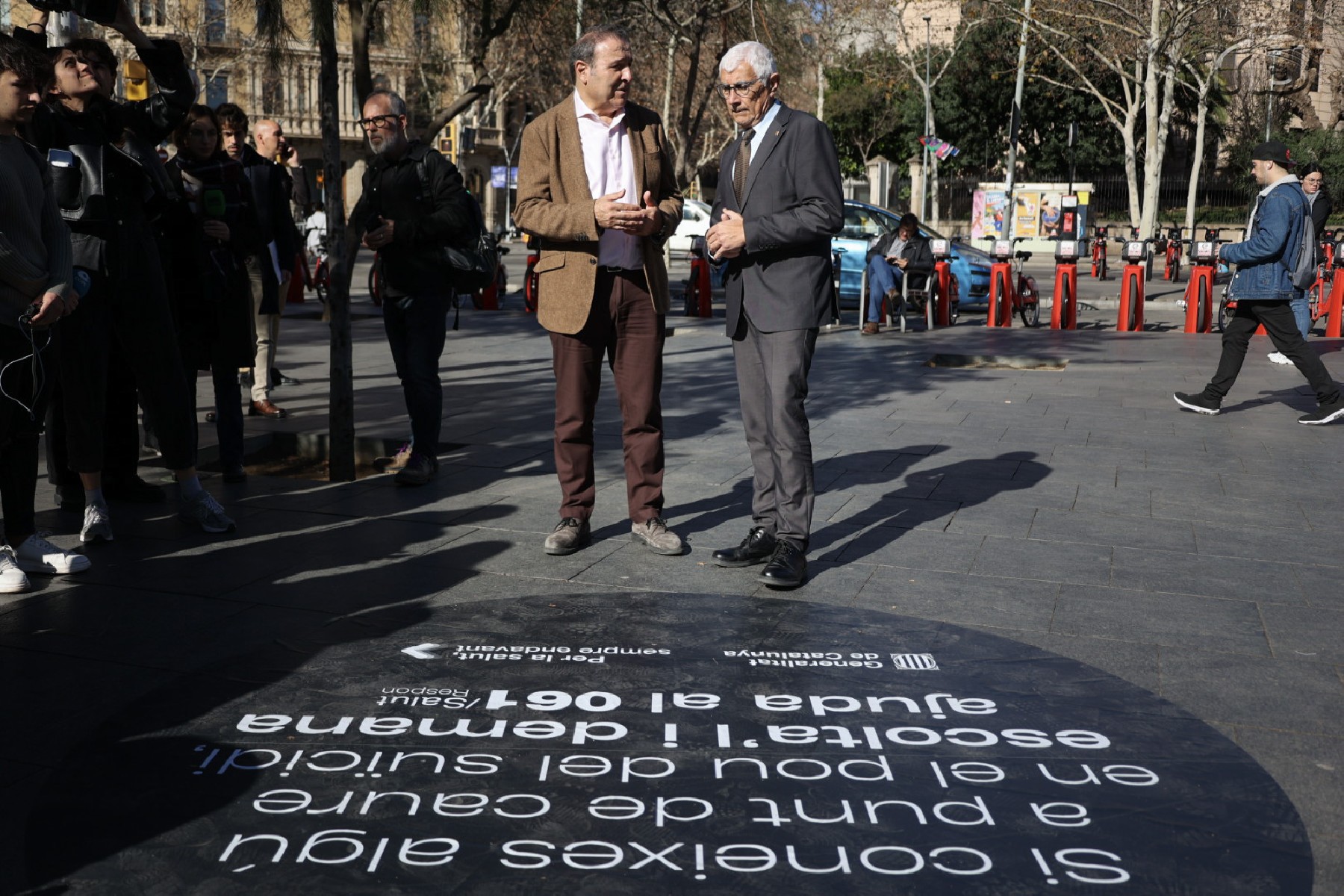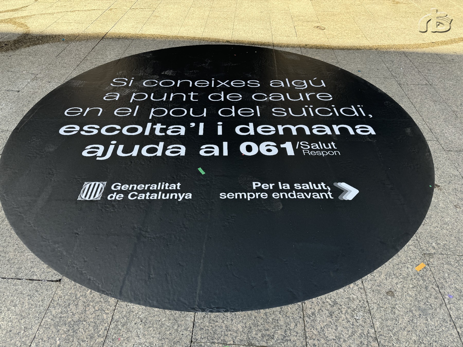 El conseller de Salut, Manel Balcells i Díaz, ha presentat avui a la plaça Universitat de Barcelona un d'aquests vinils que mostra la mateixa imatge de la campanya: un punt negre que simbolitza allà on es poden trobar les persones amb ideació suïcida. Amb aquesta instal·lació, Salut vol posar èmfasi en la detecció de senyals d'alerta i en la prevenció per part de l'entorn de les conductes que atempten contra la pròpia vida i, també en demanar ajuda, si cal, trucant al telèfon 061/Salut Respon.