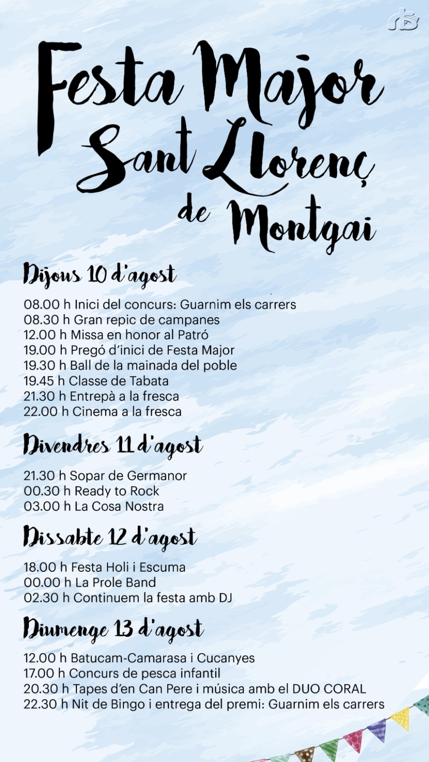 Sant Llorenç de Montgai celebra del 10 al 13 d'agost la seva festa major. Els concerts amb Ready To Rock, La Cosa Nostra i la Prole Band, i el ball del duo Coral són els actes més destacats del cartell