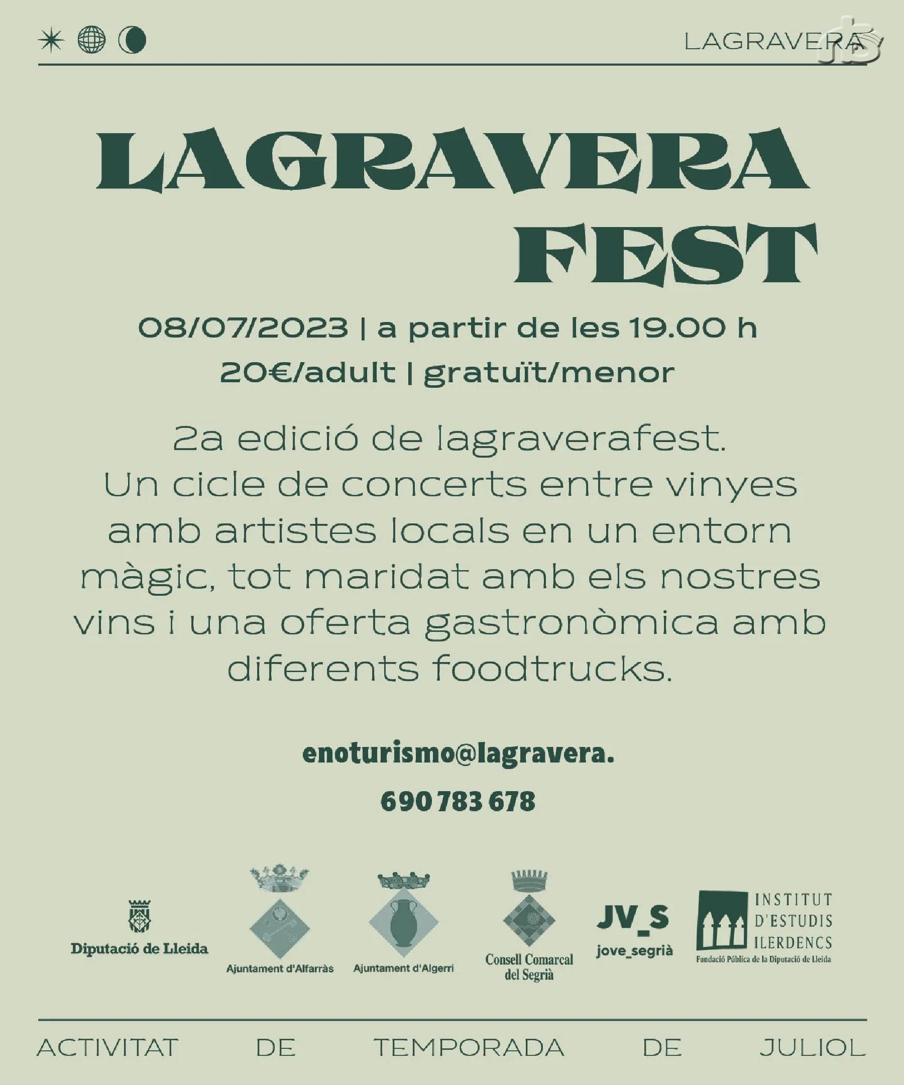 L'entrada a Lagravera Fest, inclou una visita guiada a la vinya amb el tast de dos vins del celler, a les 10.00 hores del matí; així com l'accés als tres concerts i sessió de dj., una copa commemorativa amb portacopes i una primera degustació de vi. Tot per un preu de 20 euros pels adults, una tarifa jove de 12 euros, entre els 18 i els 12 anys; i gratuïta pels menors de dotze anys. Diferents foodtrucks aportaran la seva oferta de tapes durant tota la nit.
