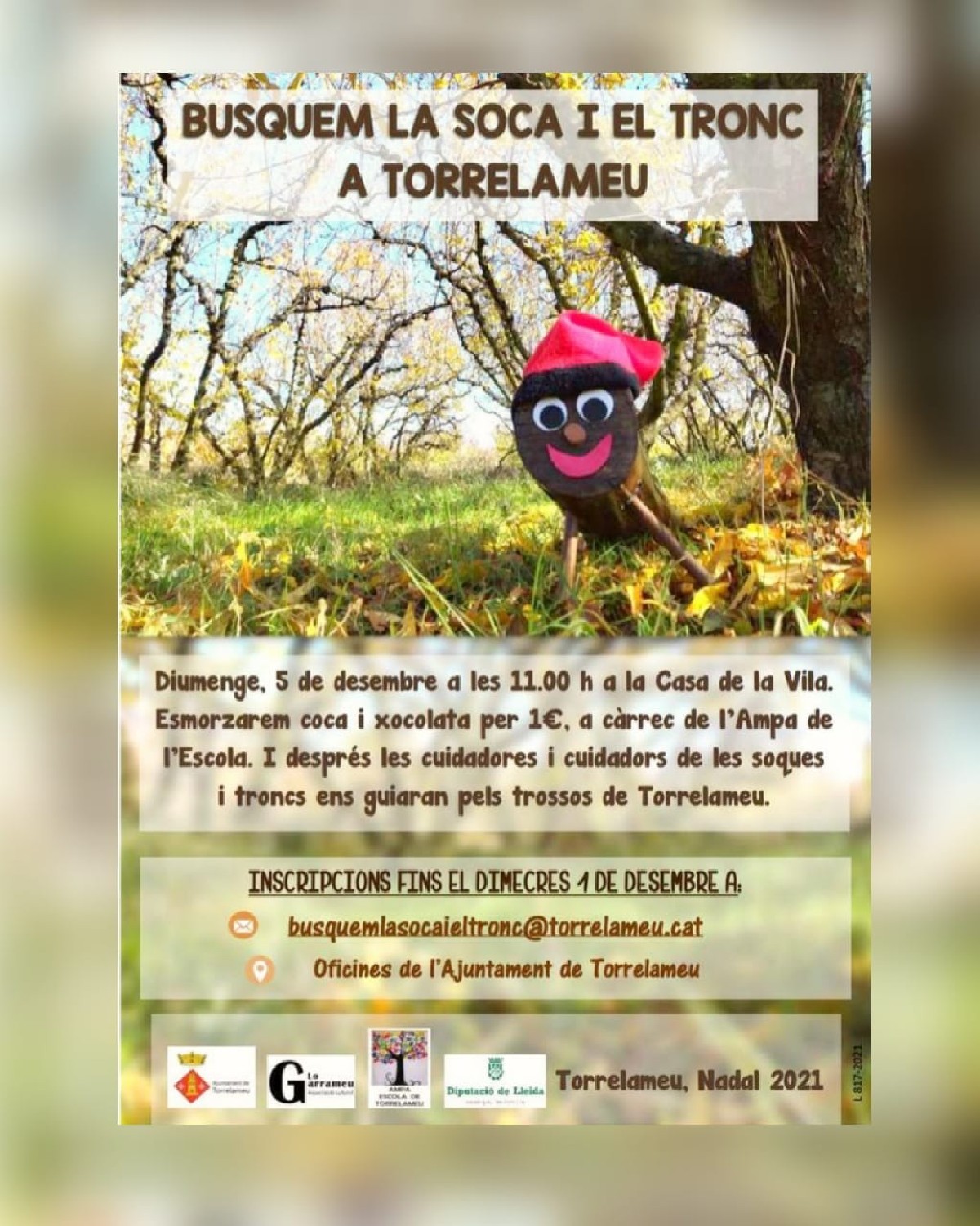 A Torrelameu l'activitat començarà a les 11 h a la Casa de la Vila. Primer se servirà als participants, per 1 euro i a càrrec de l'AMPA de l'Escola, coca amb xocolata. I seguidament, les cuidadores i cuidadors de les soques i troncs guiaran als petits pels trossos de Torrelameu fins a trobar el seu tió. Les inscripcions es poden fer fins al dimecres 1 de desembre a través del correu electrònic busquemlasocaieltronc@torrelameu.cat, o anant a les oficines de l'Ajuntament de Torrelameu.
