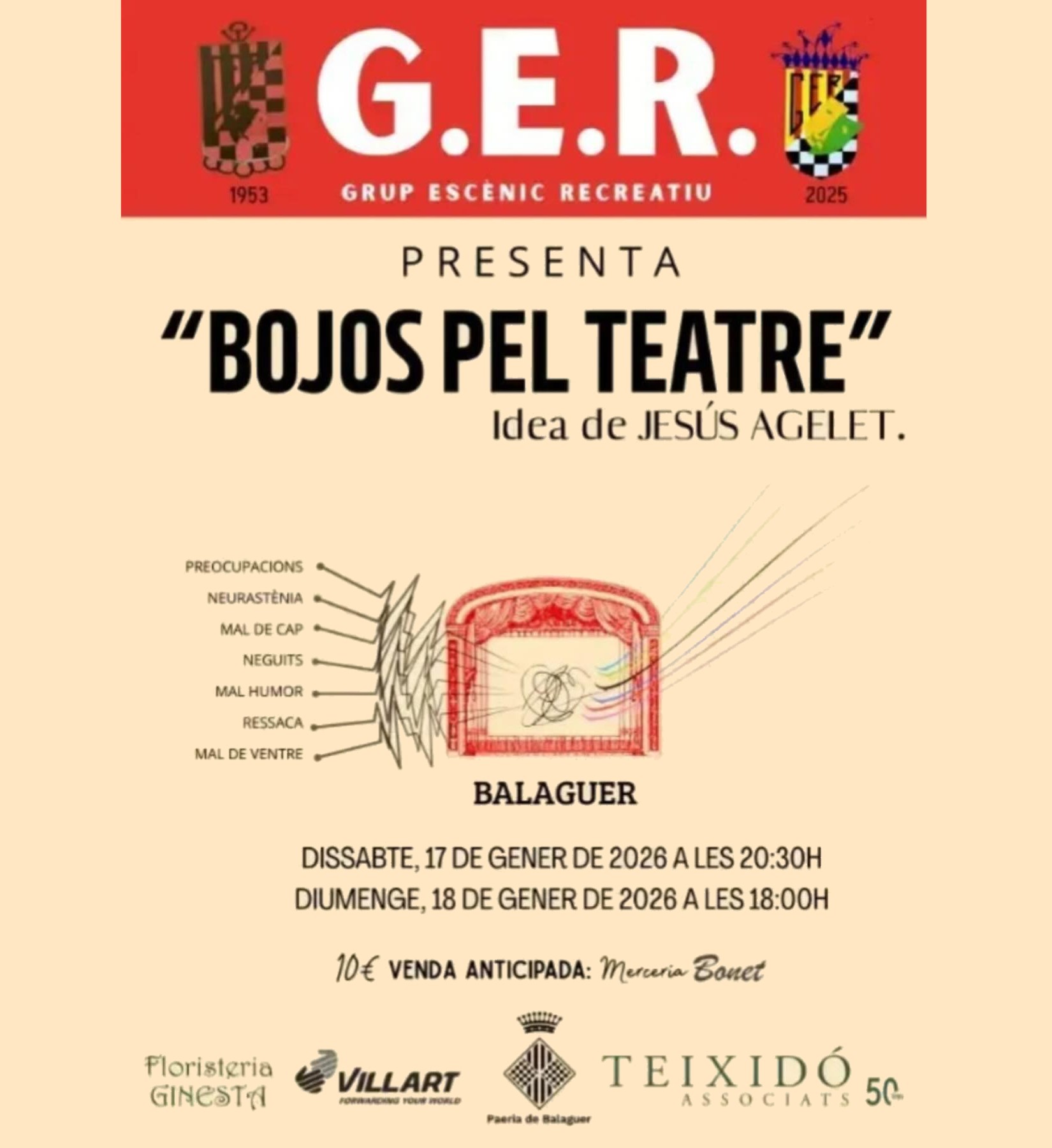 El Teatre Municipal de Balaguer serà l’escenari, aquest dissabte i diumenge, de la representació de Bojos pel Teatre, una obra que vol ser un trencadís teatral, escrit i dirigit per Jesús Agelet i interpretada pel GER