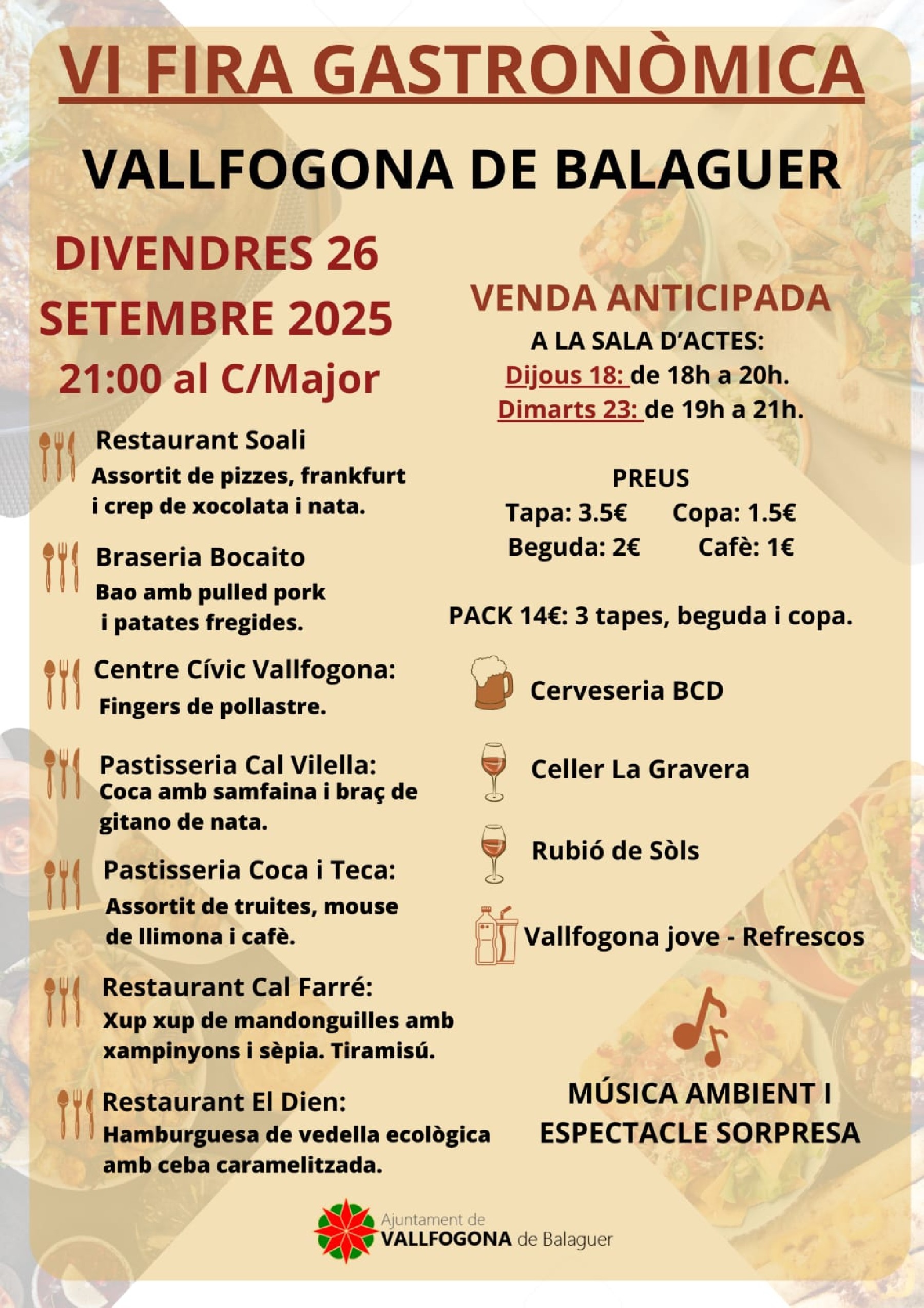 La fira tindrà lloc al carrer Major a partir de les 20.30 h i oferirà un ampli ventall de tapes elaborades amb productes locals, a un preu de 3,5 euros cadascuna i amb begudes a 2 euros. A més, s'hi podrà adquirir anticipadament un pack especial de tres tapes i una beguda, amb envàs inclòs, al preu de 14 euros. Els tiquets es trobaran a la venda el mateix divendres a la barra. L'activitat es completarà amb música ambient i espectacles, convertint el carrer en un gran espai de trobada gastronòmica i festiva.