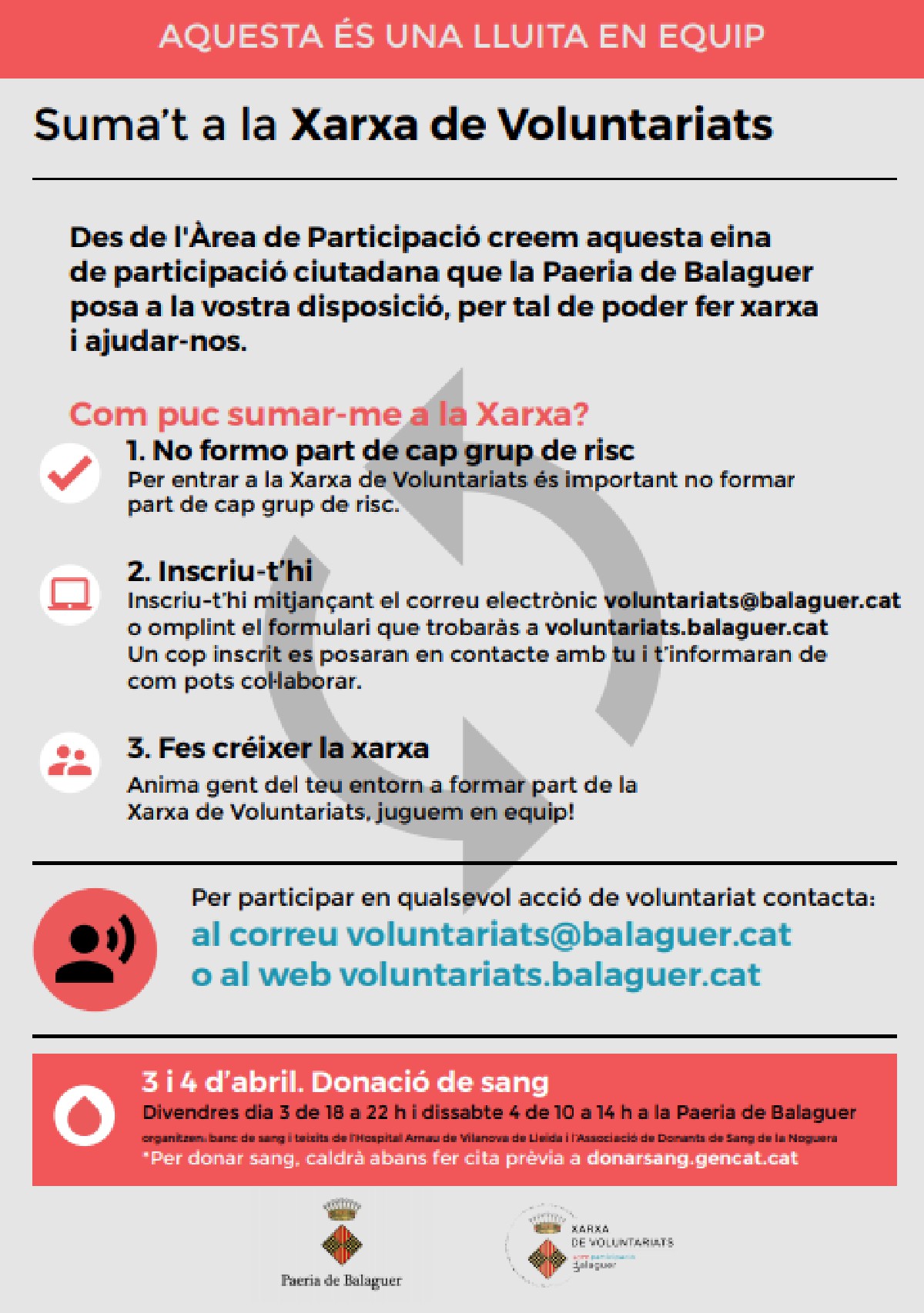 Recordem que totes aquelles persones que es vulguin acollir a la xarxa, és a dir, que necessitin que els voluntaris els facin la compra, els passegin la mascota, tinguin cura dels seus fills o filles o, simplement, necessitin parlar amb algú o fer algun tràmit administratiu o de salut poden trucar al telèfon 660 756 719 de 9.00 a 14.00h i de 16.00 a 20.00h o enviar un correu a voluntariats@balaguer.cat.