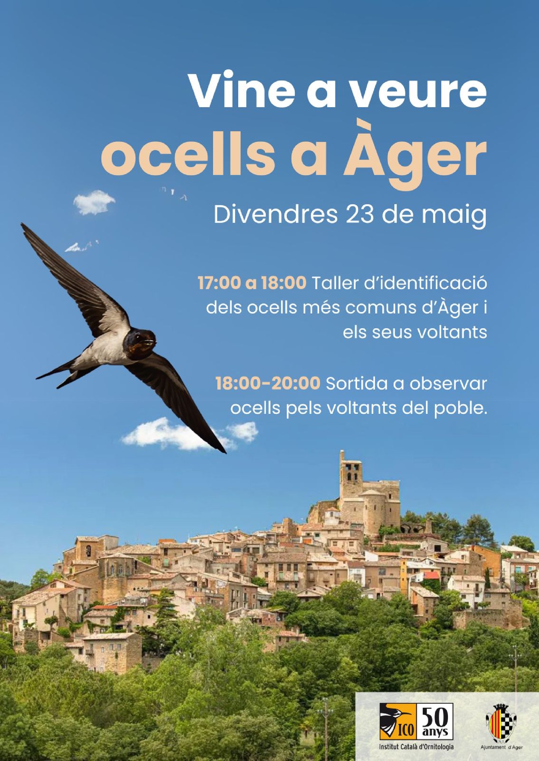 El municipi d'Àger serà l'escenari del primer acte de celebració del 50è aniversari de l'Institut Català d'Ornitologia (ICO), entitat referent en l'estudi i conservació dels ocells a Catalunya. La commemoració tindrà lloc aquest dissabte 24 de maig a la Col·legiata de Sant Pere, i inclourà una jornada dedicada als col·laboradors i col·laboradores de l'ICO, amb activitats dirigides a professionals del sector ornitològic. A més, divendres a la tarda s'han programat activitats obertes a tota la ciutadania, com un taller d'identificació d'ocells i una sortida de camp pels voltants del poble.