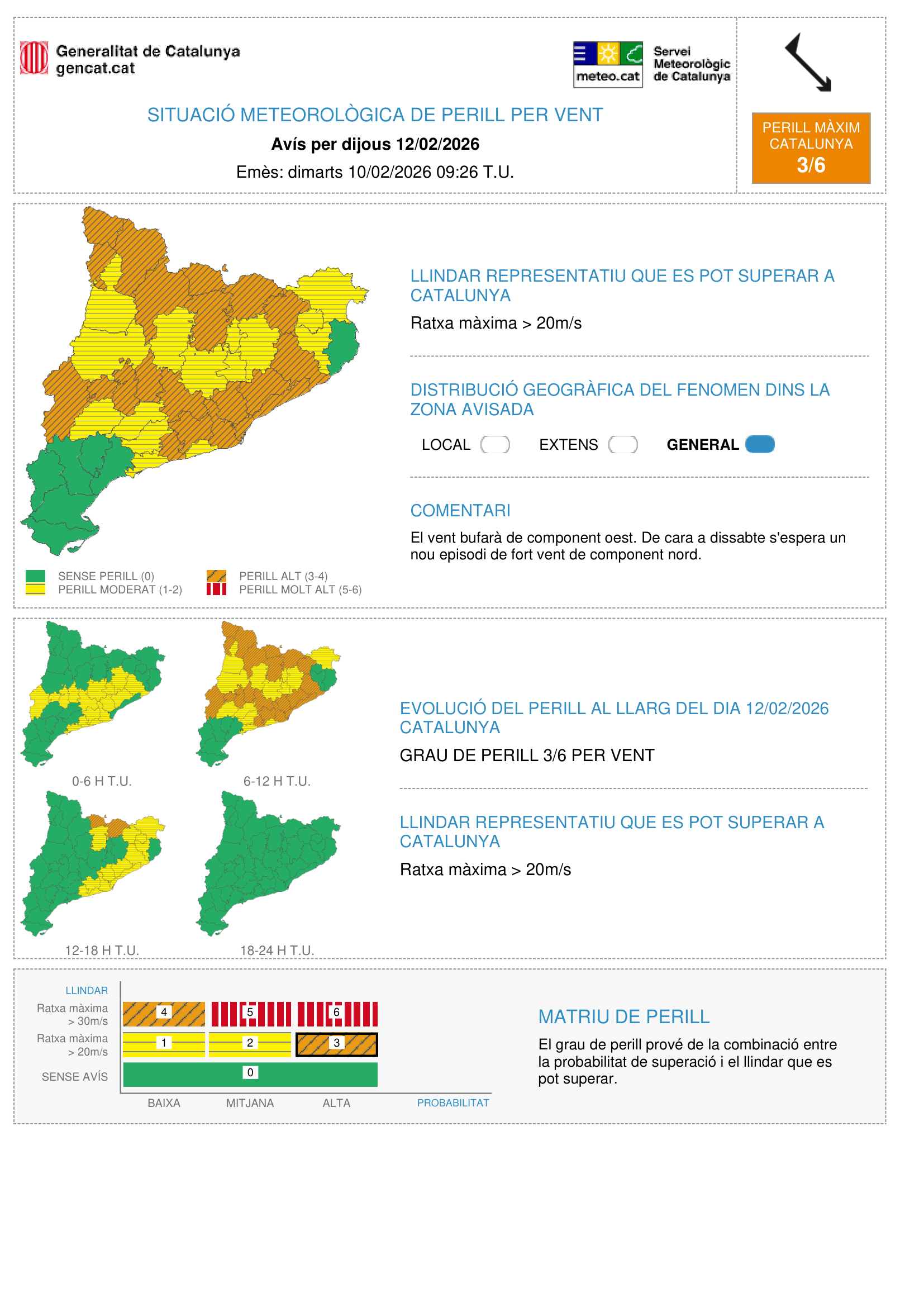 Durant el dijous 12 de febrer l'episodi continuarà fins a la mitja tarda i s'estendrà a la pràctica totalitat del territori, amb més probabilitat de superació del llindar de 72 km/h a les comarques del Pirineu, zona del litoral i prelitoral central i a la franja central del territori. La distribució geogràfica del fenomen dins la zona avisada serà general i el vent continuarà bufant de component oest. Dijous es preveu també fort onatge, maregassa amb onades de 2,5 m, al litoral central i nord.