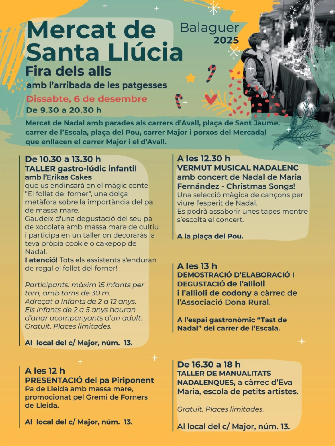 Un any més, l’Associació Dona Rural oferirà una mostra d’alls i l’elaboració d’allioli de codony i sopa d’alls, preparada segons la recepta de Josep M. Morell. I a les 12h es farà la presentació del “Pa Piriponent”, a càrrec del Gremi de Forners de Lleida. I a les 12.30h Vermut musical nadalenc amb el concert de **Maria Fernández – Christmas Songs!