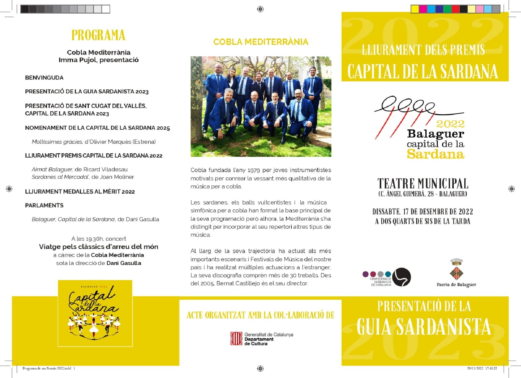 El Teatre Municipal de Balaguer acollirà el proper dissabte 17 de desembre els actes de lliurament dels Premis Capital de la Sardana 2022, la presentació de la Guia Sardanista del 2023 i el concert "Viatge pels clàssics d'arreu del món", a càrrec de la Cobla Mediterrània.