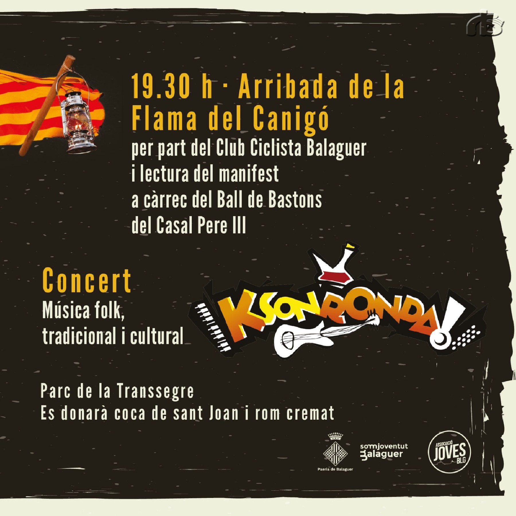 A partir de 2/4 de 8 del vespre, d'altra banda, està prevista l'arribada de la flama del Canigó al Parc de la Transsegre, per part del Club Ciclista Balaguer, i la lectura del manifest de Sant Joan a càrrec del ball de bastons del Casal Pere III.