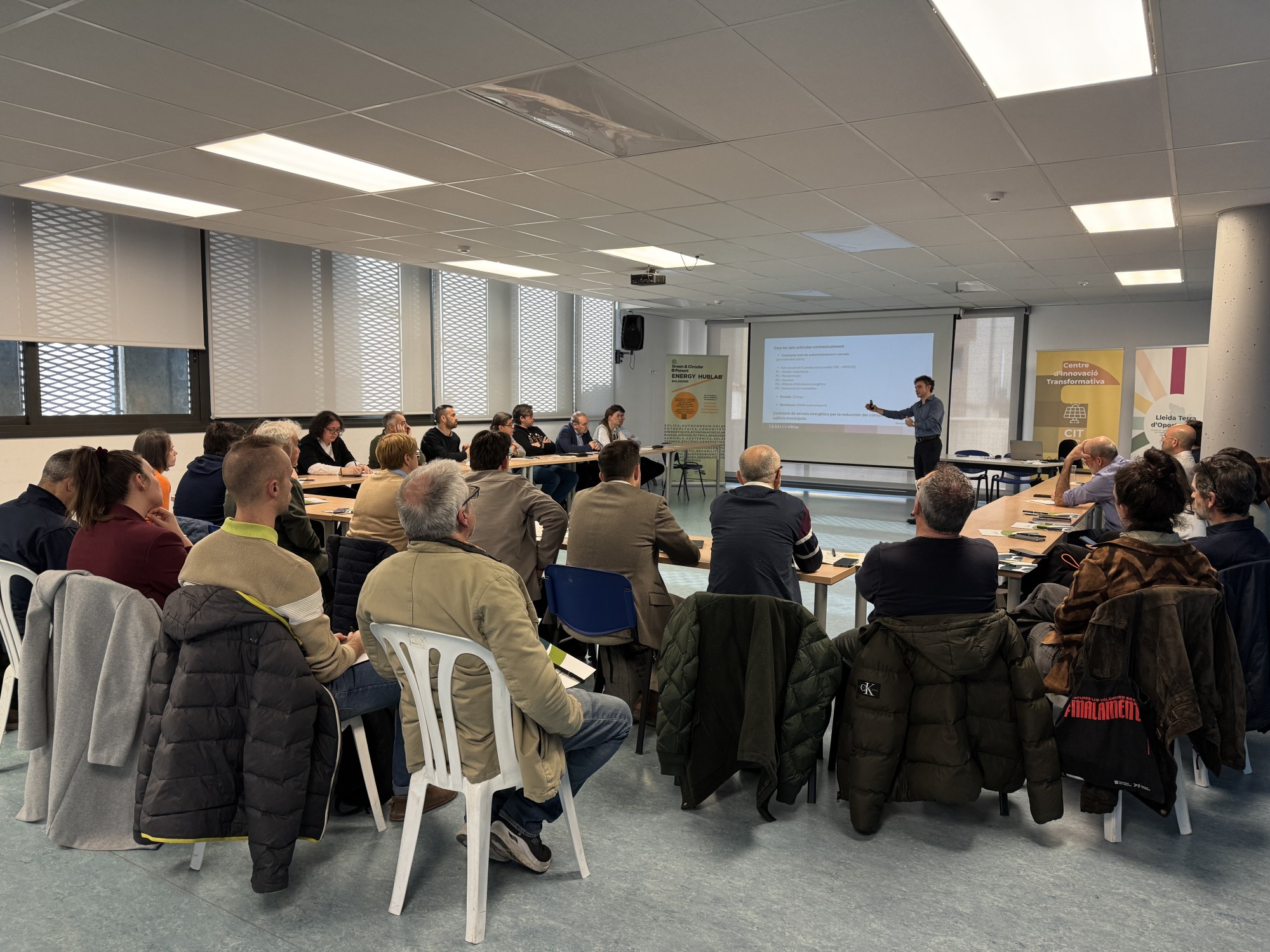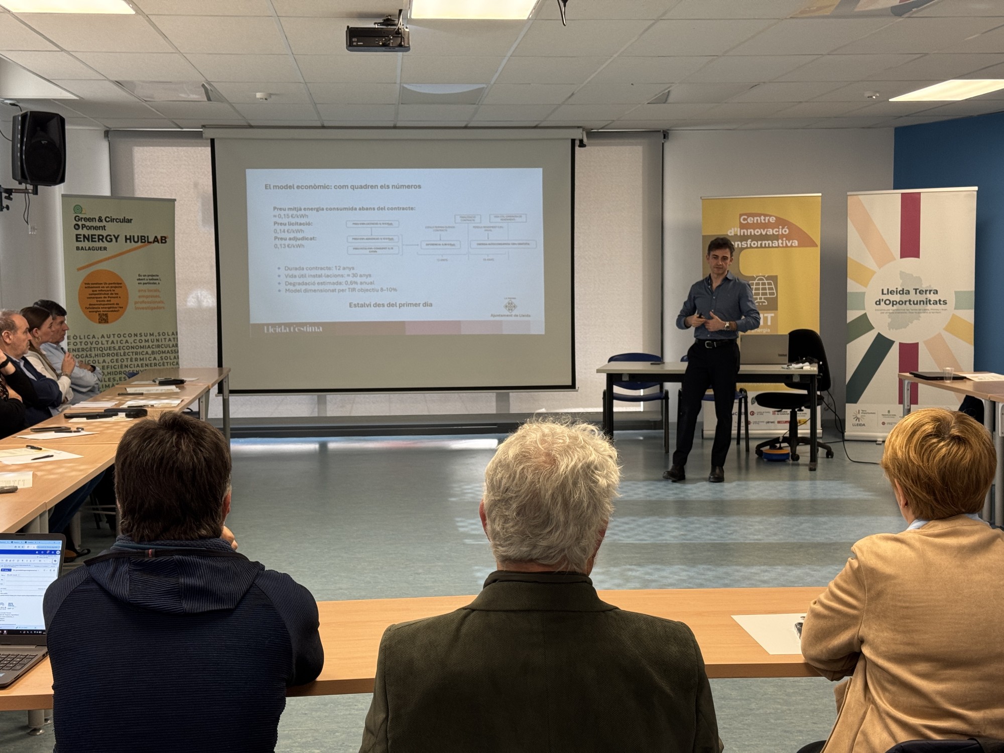 L’acte ha comptat amb una ponència a càrrec de Cristian Riera i Ignasi Valgañón, experts en l'àmbit de l'energia de l'Ajuntament de Lleida. La presentació ha abordat un model innovador de contracte de serveis energètics per a la implantació de la fotovoltaica i l’eficiència energètica als edificis municipals, sense necessitat d'inversió inicial, un projecte que es vol replicar en altres entitats locals.