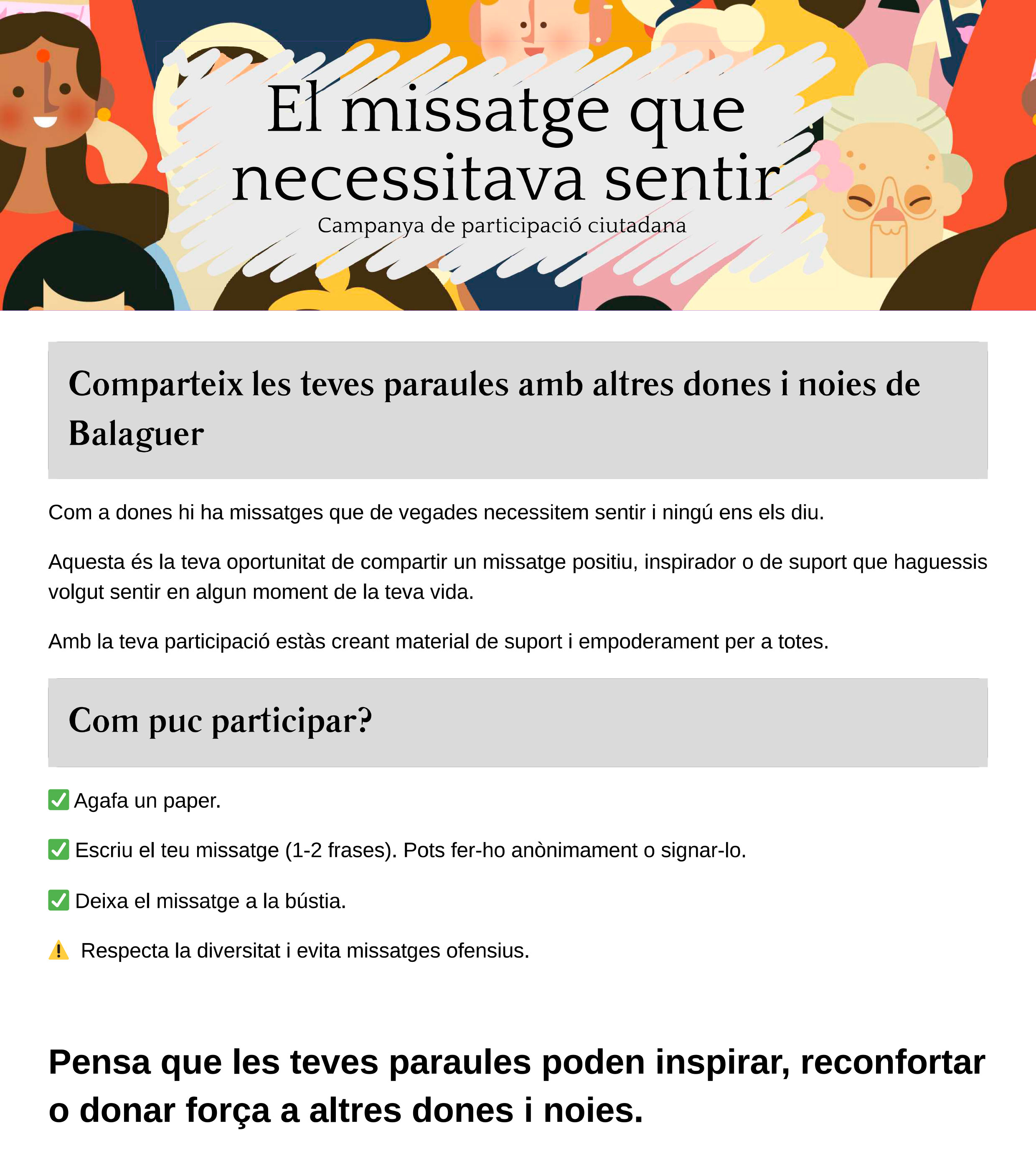Des de l’organització es demana respecte per la diversitat i que s’evitin missatges ofensius, amb la voluntat que les paraules compartides puguin reconfortar, inspirar o donar ànims a altres dones i noies.