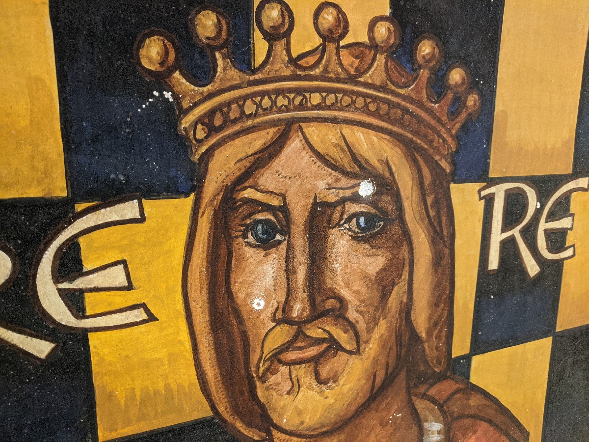 Es tracta del mural dels Comtes d'Urgell obra de Jaume Minguell, i compta amb força cops i esquerdes però també amb una capa de fum i sutge arran de l'incendi que hi ha va haver fa uns anys a la sala d'actes de la Paeria