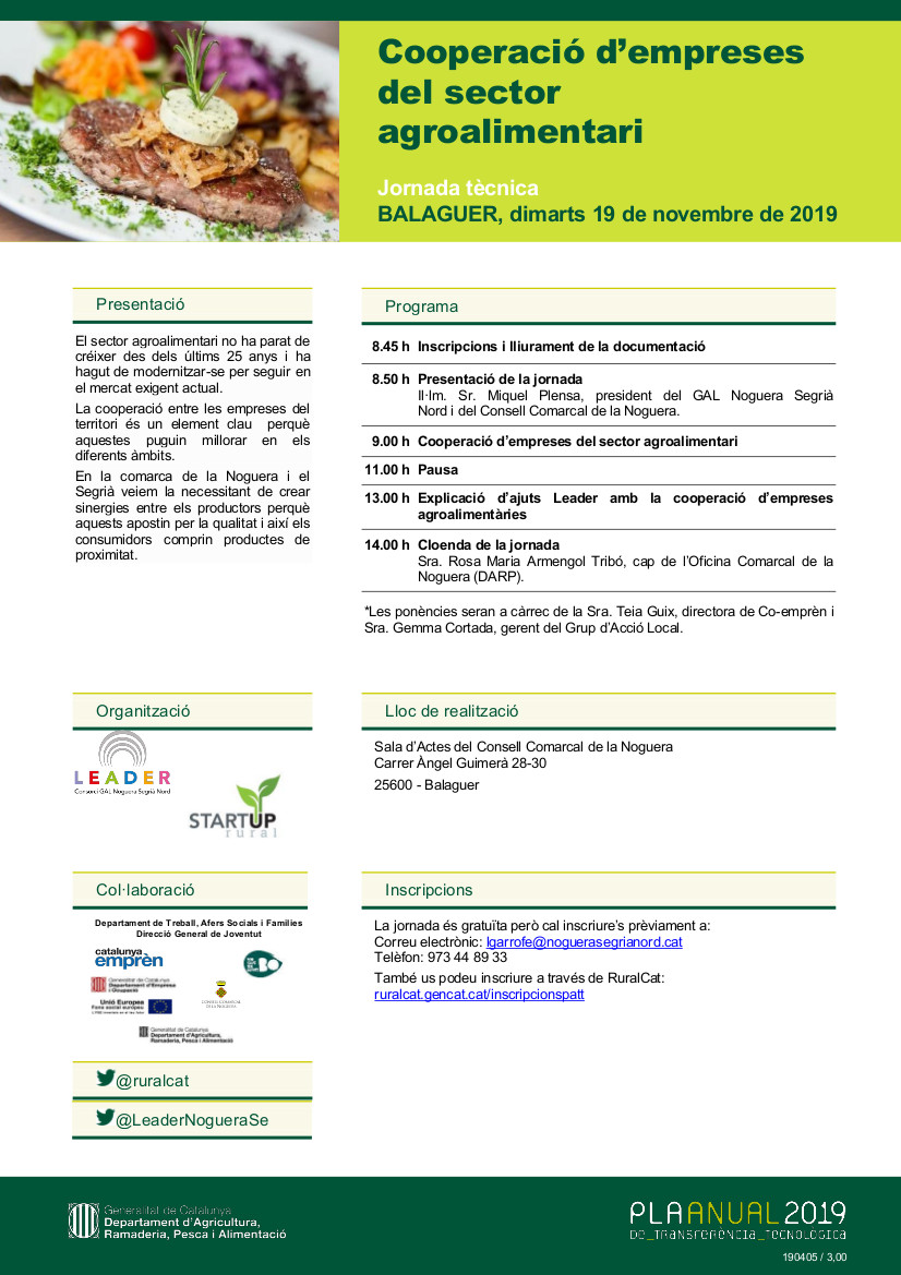 El Consorci Grup d'Acció Local Noguera Segrià Nord organitza conjuntament amb el Leader del Camp la jornada 'Cooperació d'empreses del sector agroalimentari' que es realitzarà al Consell Comarcal de la Noguera aquest dimarts 19 de novembre.