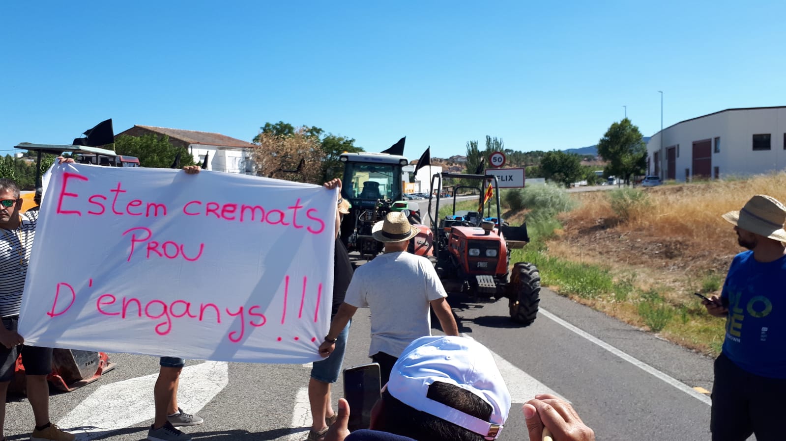 Uns 200 pagesos i ramaders afectats pel foc de la Ribera d'Ebre tallen la C-12 a Flix per quart cop. Els manifestants mostren pancartes reclamant la dimissió de la consellera Jordà després que aquesta no els rebés dimecres