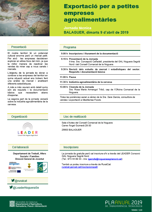El Consorci GAL Noguera-Segrià Nord ha organitzat pel proper dimarts, 9 d'abril, una jornada tècnica sobre exportació per a petites empreses agroalimentàries.