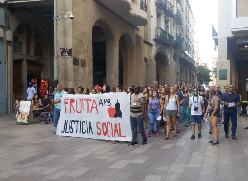 Manifestació a Lleida per denunciar que més d'un centenar de temporers dormen al carrer. Les entitats signants de la Campanya Fruita amb Justícia Social reivindiquen allotjament municipal pels treballadors
