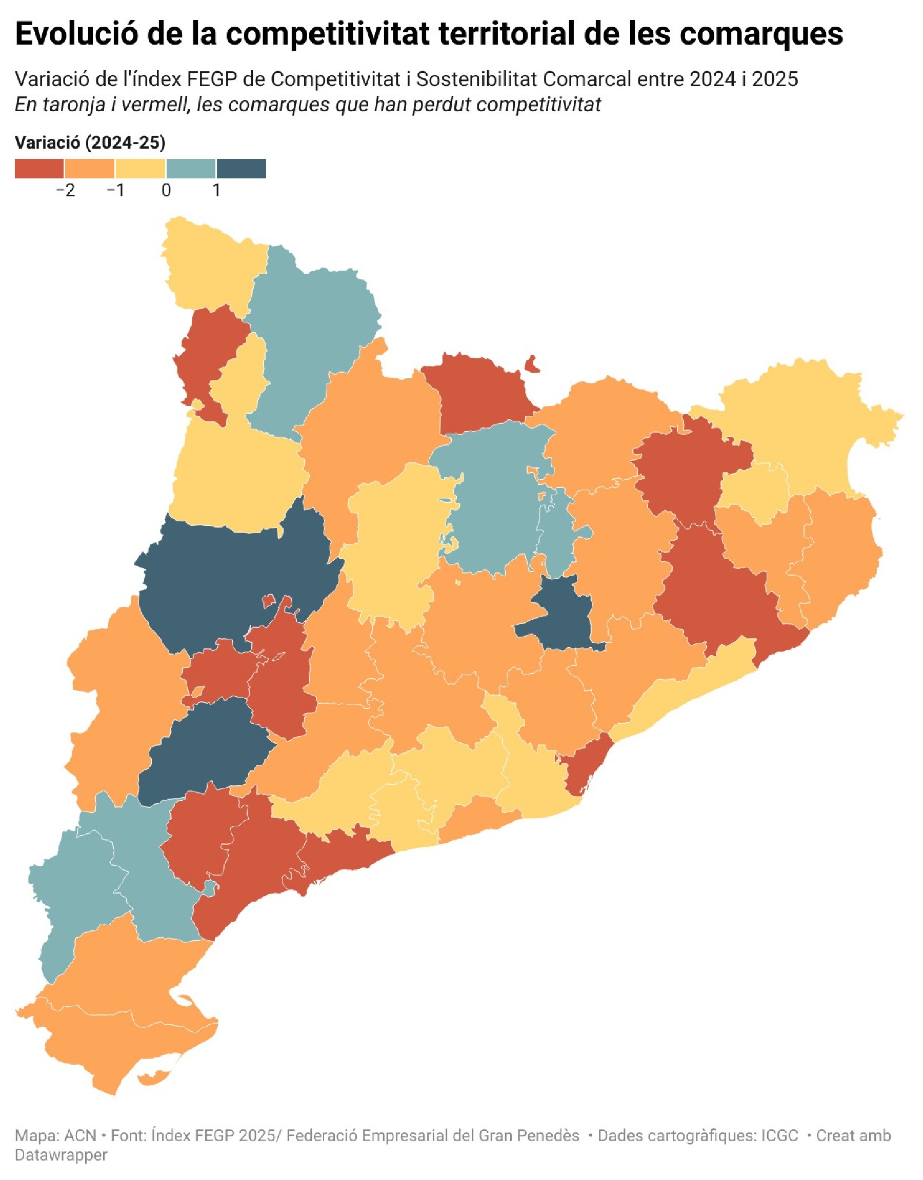 Alerten d'un 'risc d'estancament' de Catalunya per una pèrdua de competitivitat en 36 comarques el 2024. L'índex de la FEGP constata un 'menor dinamisme' al país i reclama una 'estratègia territorial més activa'
