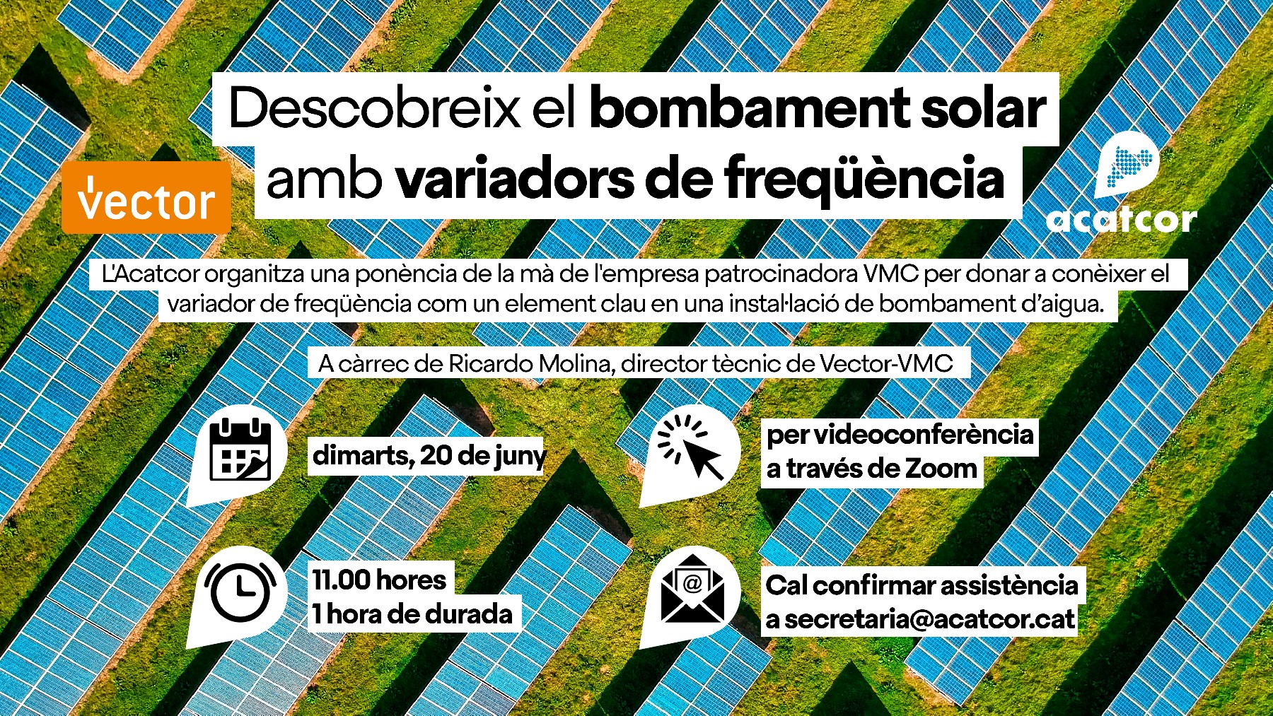 L'ACATCOR prepara dues jornades per abordar el bombament solar amb variadors de freqüència i una solució a les fuites d'aigua als canals de reg. Tindran lloc aquesta setmana, de forma telemàtica