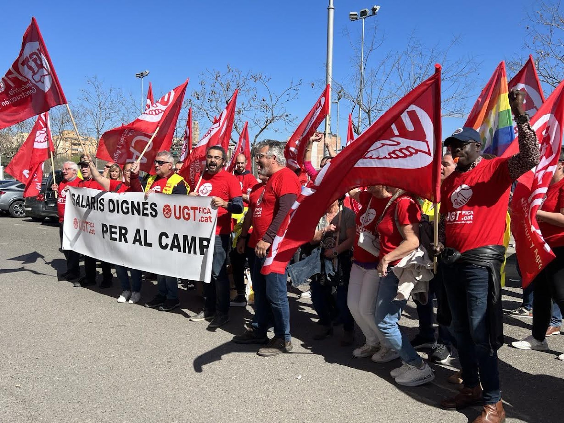 Acció de protesta de la UGT-FICA davant la Unió de Pagesos a Lleida per exigir equiparar les taules salarials del camp a l'SMI