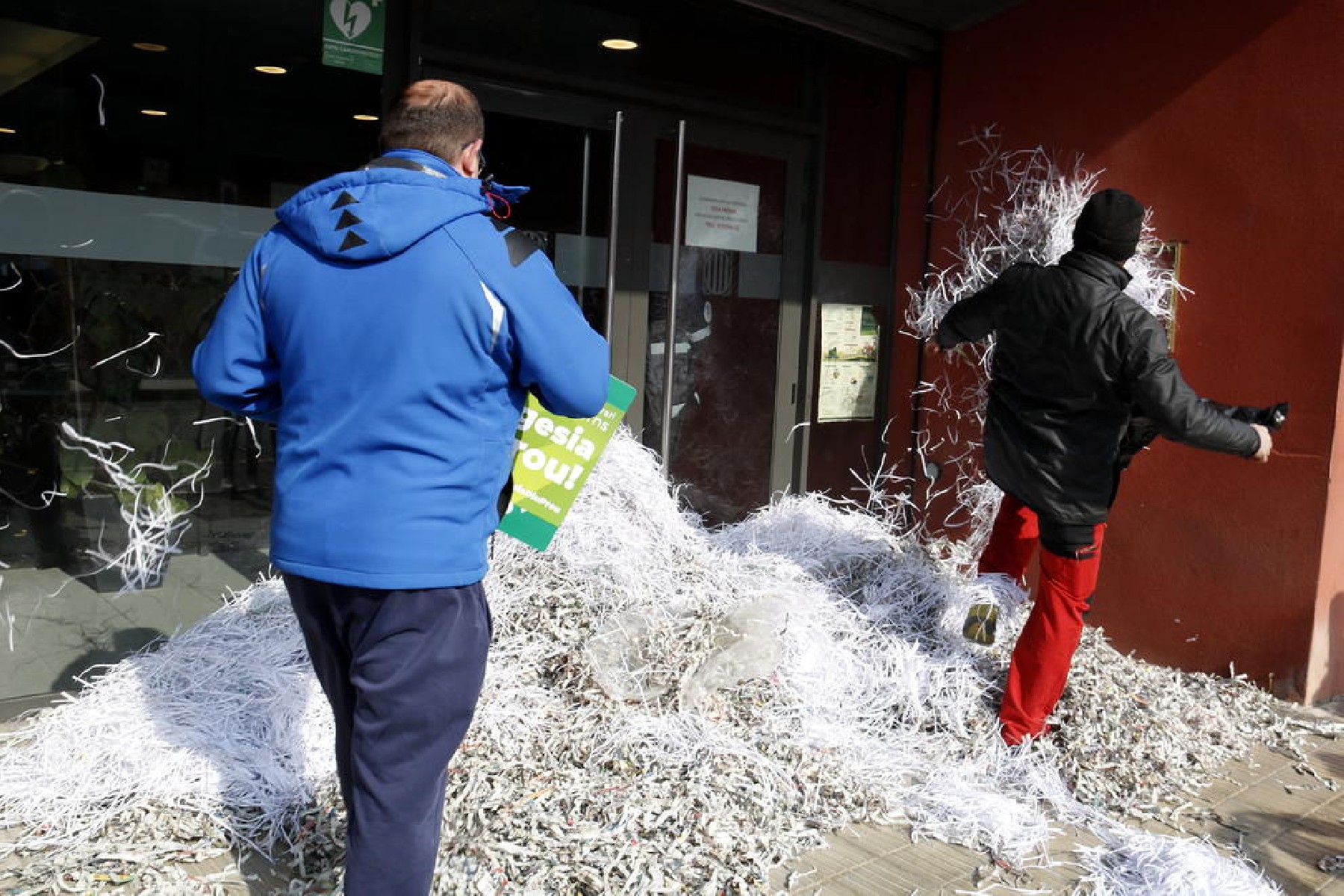 Ramaders i pagesos omplen de papers triturats l'entrada d'Acció Climàtica a Lleida per denunciar l'excés de burocràcia. Demanen que les granges estiguin exemptes de presentar la declaració anual de residus perillosos per evitar duplicitats