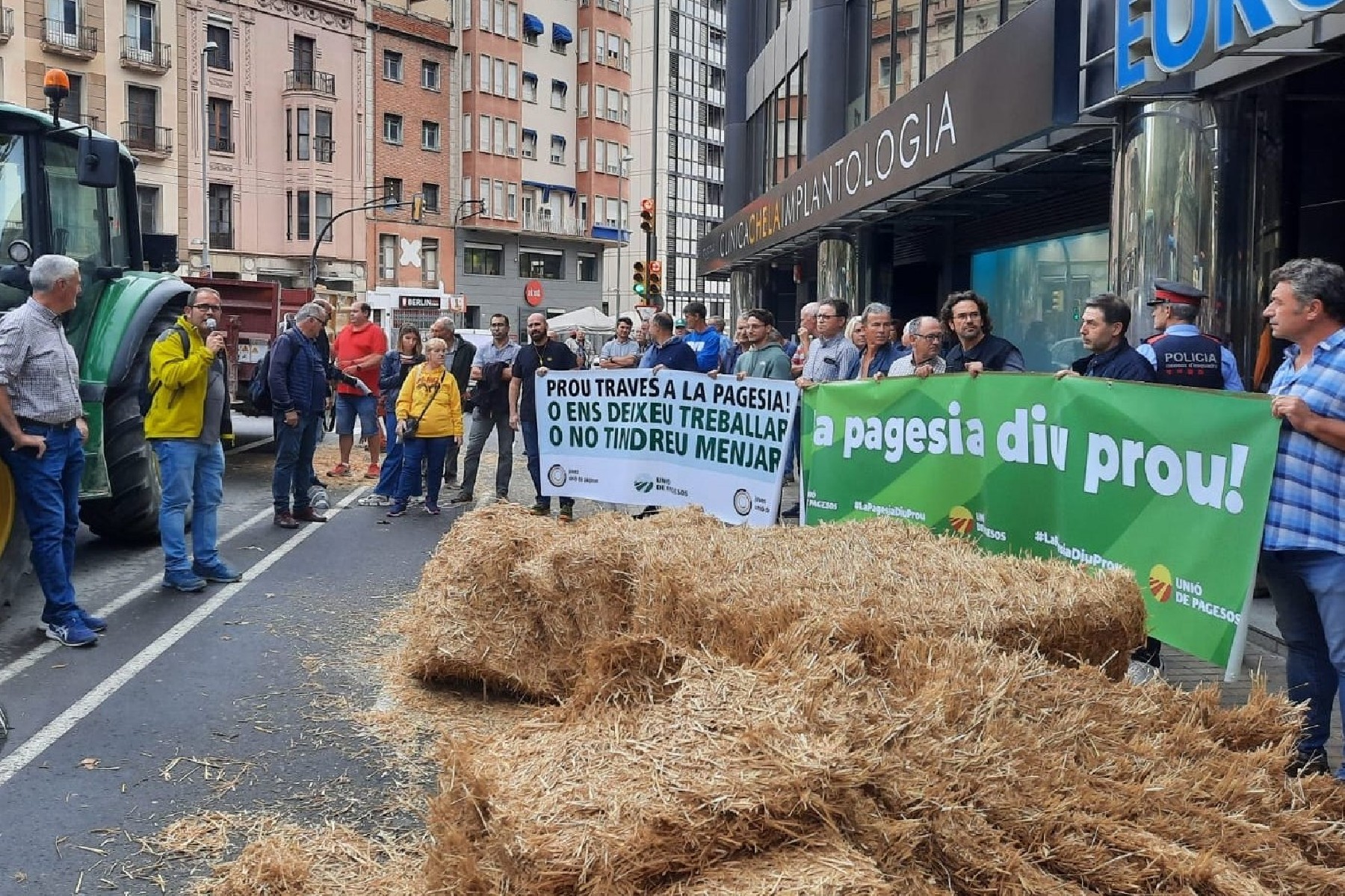 Unió de Pagesos exigeix línies de finançament per al sector agrari amb una acció reivindicativa a Lleida. L'organització escampa una bala de palla davant de la seu d'Economia per expressar el malestar de pagesos i ramaders